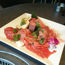 サラダ、お肉を中心とした前菜、焼肉盛り合わせ、トマト冷麺。