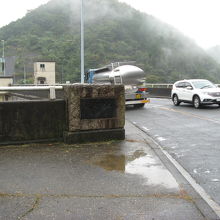 ダム堤体上は国道25号が通り、時々車が通るので駐車場に車を停めて歩いて堤体を渡って見学しました。堤体上から下流側を覗くと高さが60mほどあるのでなかなか良い眺めで、コンジットゲートから放水しているところを観ることができました。