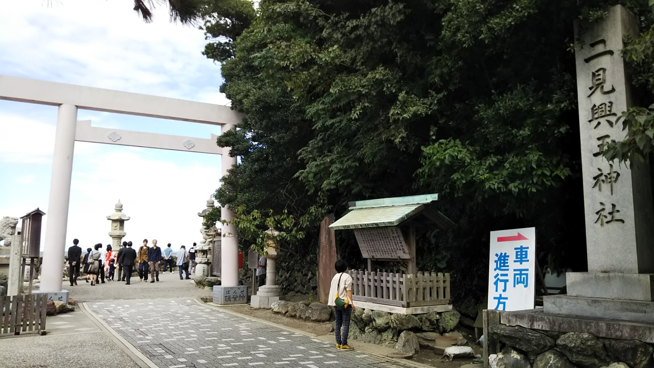 大変混雑していました。駐車場に向かうと警備員から二見支所の駐車場が無料だと案内されました。少し歩きましたが、気候もよく快適でした。カエルの手水舎もありました。お参りした後、御朱印もいただくことができました。