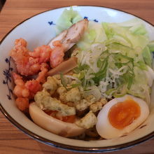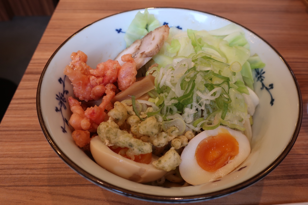 まぜそば、汁そばの看板が出ていて、まぜそば490円とお手軽値段でびっくり。カウンターとテーブル席少しの小さな店です。14時近くということもあって客は少なく、テーブルに座りました。せっかくなので坦々まぜそば590円に。胡麻ベースの濃厚まぜそばということです。太麺なので茹でるのに多少時間がかかって登場。2玉まで麺大盛り無料とのことでしたが、それほど空腹でなかったので、普通盛りにしても結構な量。テーブルにある揚げ玉をのせていただきます。チャーシューは大きくこの値段にしては上出来です。