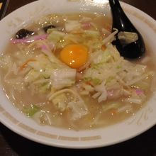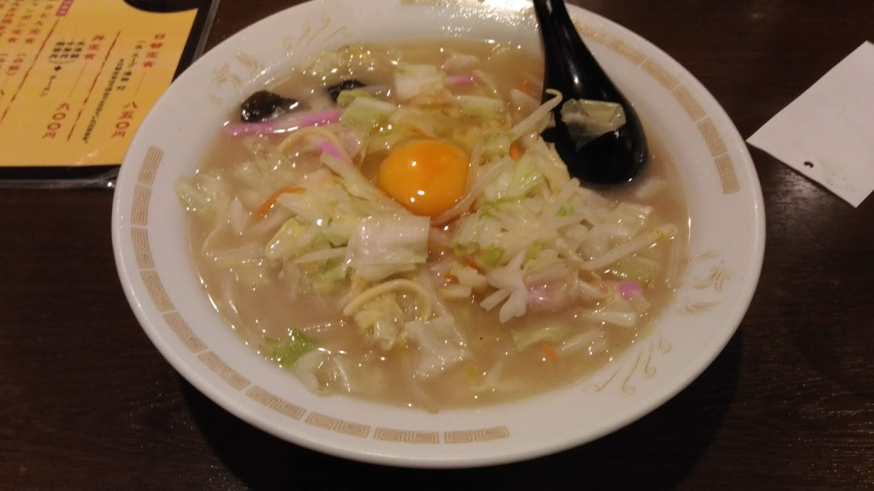 登場したちゃんぽんを見て、何かビジュアル的に冴えない、彩がないからかな、野菜ののりが少ないからか。スープと麺はいいですね。生卵がのっているのは大阪風ですね。まあ悪くはかいけどという感じでした。