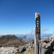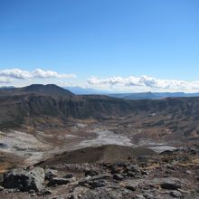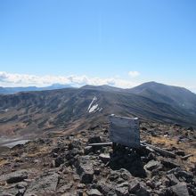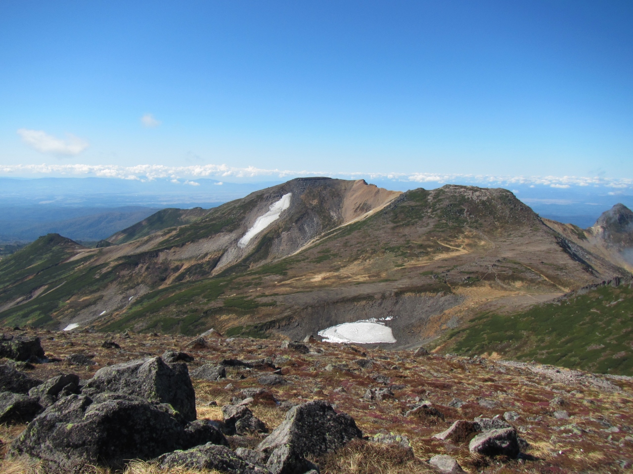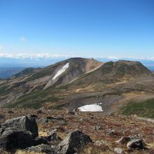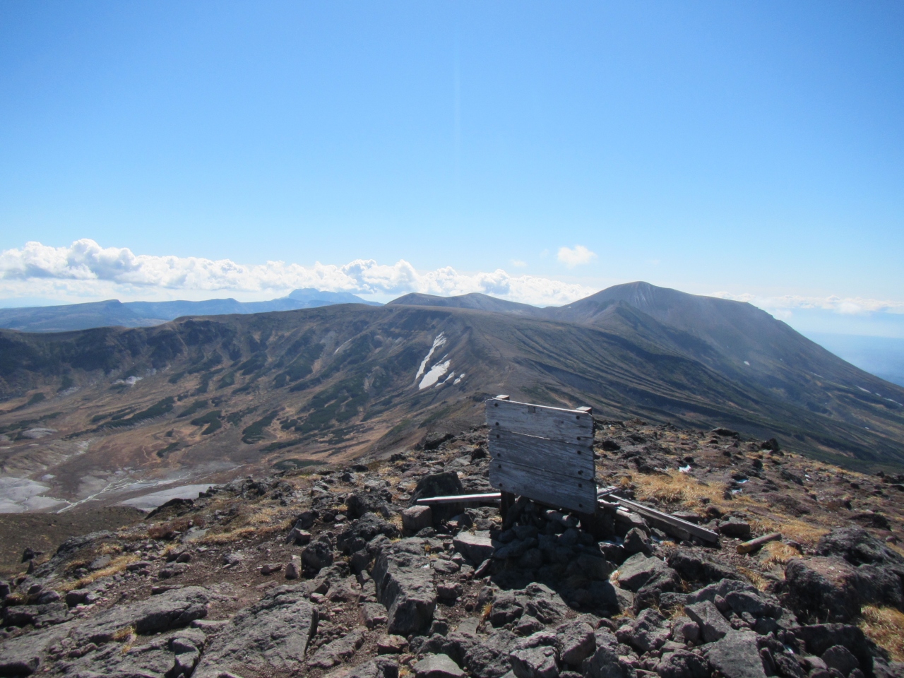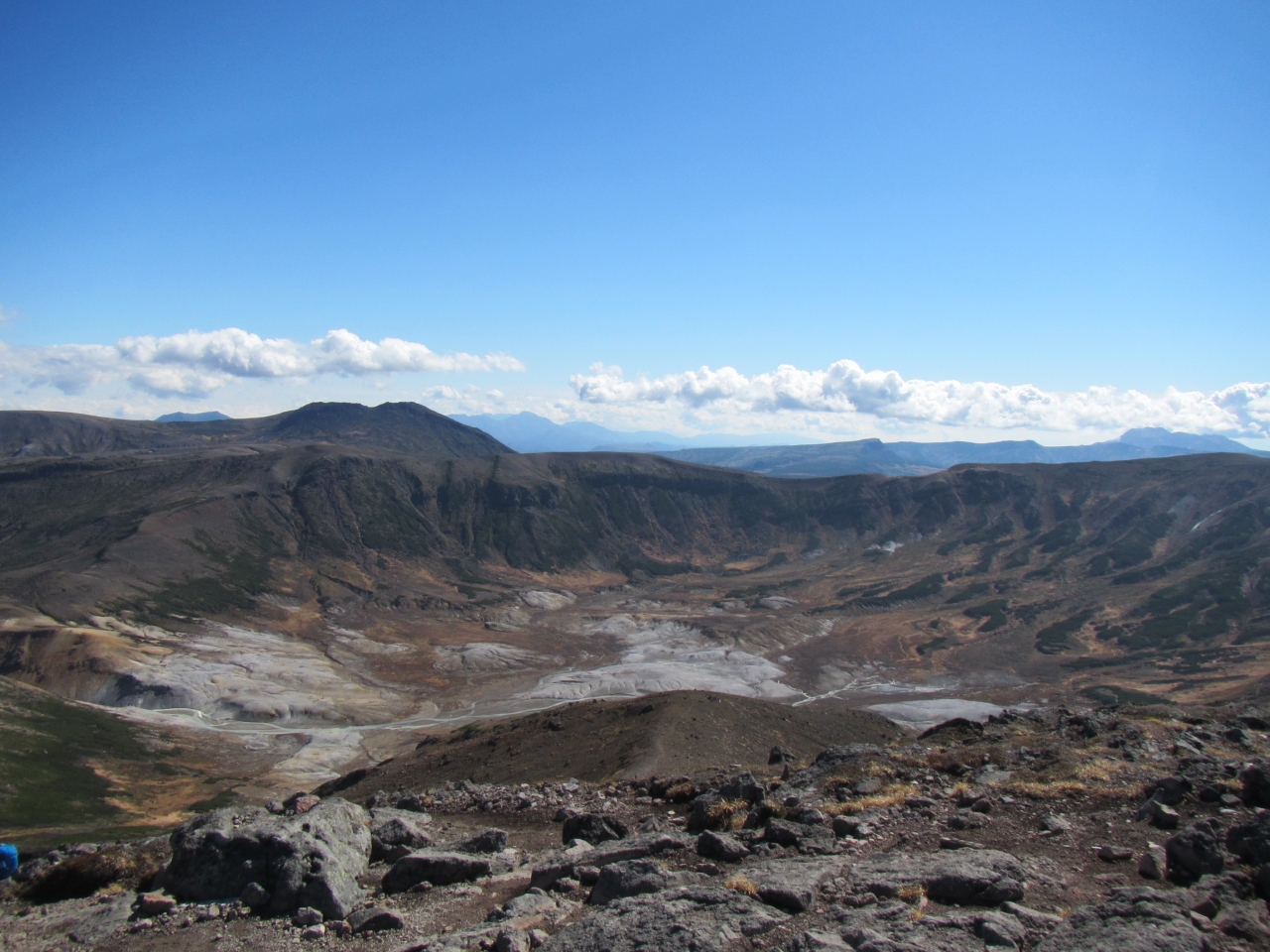 北鎮岳山頂からは、南側に広がるお鉢平を高見から見下ろし、背後にトムラウシ、石狩岳連峰、十勝岳連峰などの大雪山系の山並みを遠望する絶景が眺められます。
