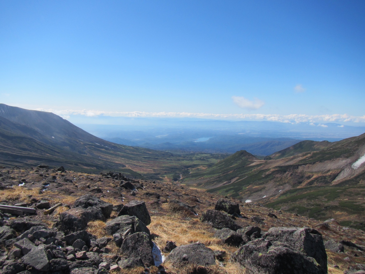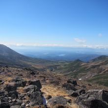 また、東側には、旭岳の横合いに裾合平が広がる様子やその向こうに秋の田が黄金色に輝く上川盆地と旭川の市街が見えました。