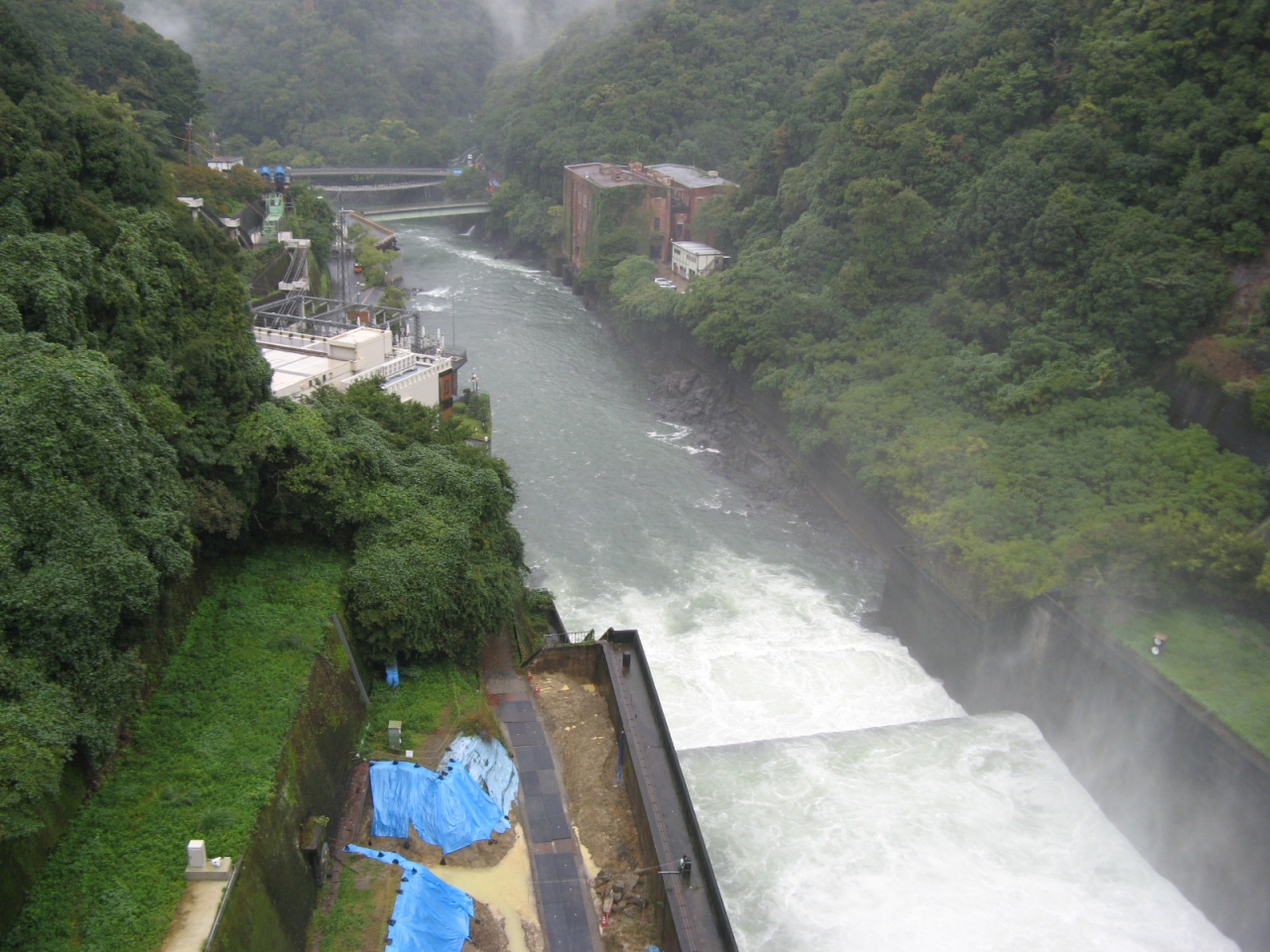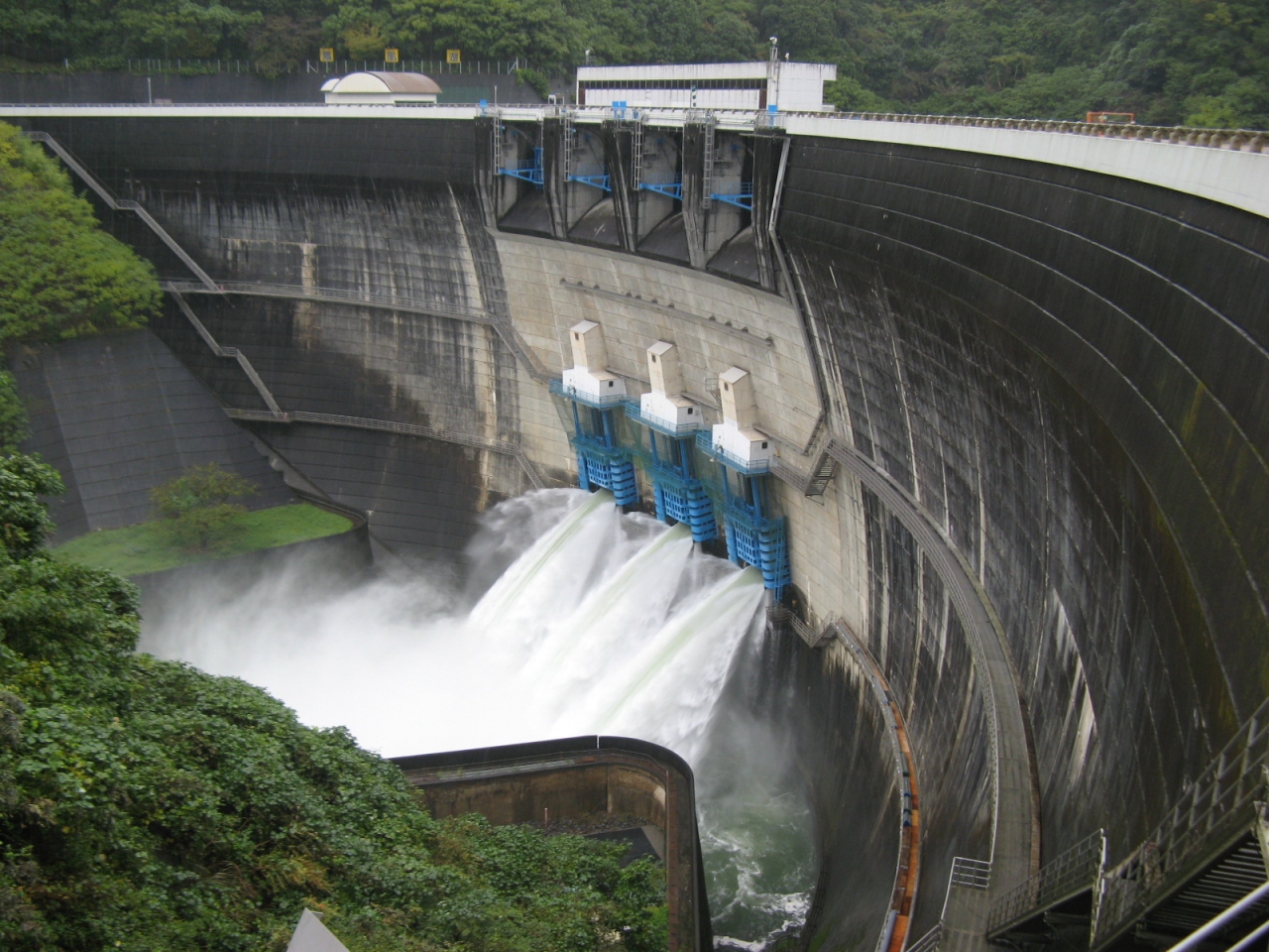 アーチダムのなかでも群を抜いて美しい曲線美を持っていますが、竣工が1964と比較的古いので堤体の表面は黒く時代を感じさせます。放流設備は、非常用洪水吐としてクレスト部にラジアルゲートを4門、常用洪水吐としてコンジットゲートを3門備えています。