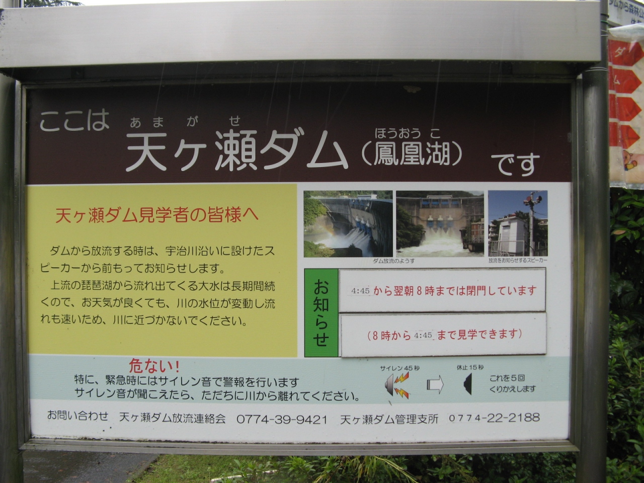 天ケ瀬ダムは洪水調節、上水道、発電を目的とした堤高73m、堤頂長254mのドーム型アーチ式コンクリートダムで、ダムによって造られたダム湖を“鳳凰湖”と呼びます。