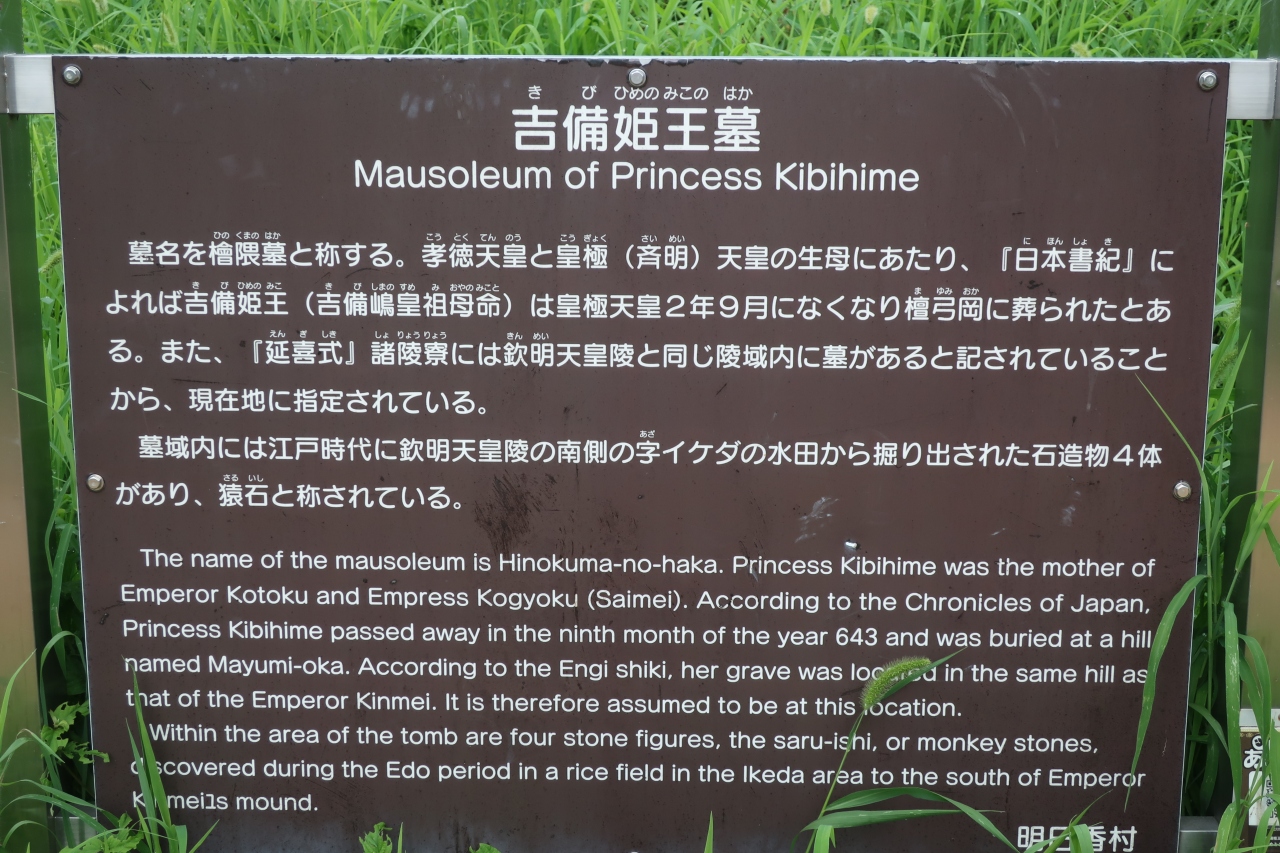 吉備姫王は欽明天皇の孫で皇極天皇、孝徳天皇の母です。その墓陵は欽明天皇陵の近くにあります、欽明天皇陵とは比較にならない程小さな墓です。吉備姫王墓は駐車場から少し細い道を上がり回り込む様に行かなければならず案内板がないと分かり辛い所にあります。
