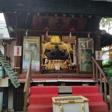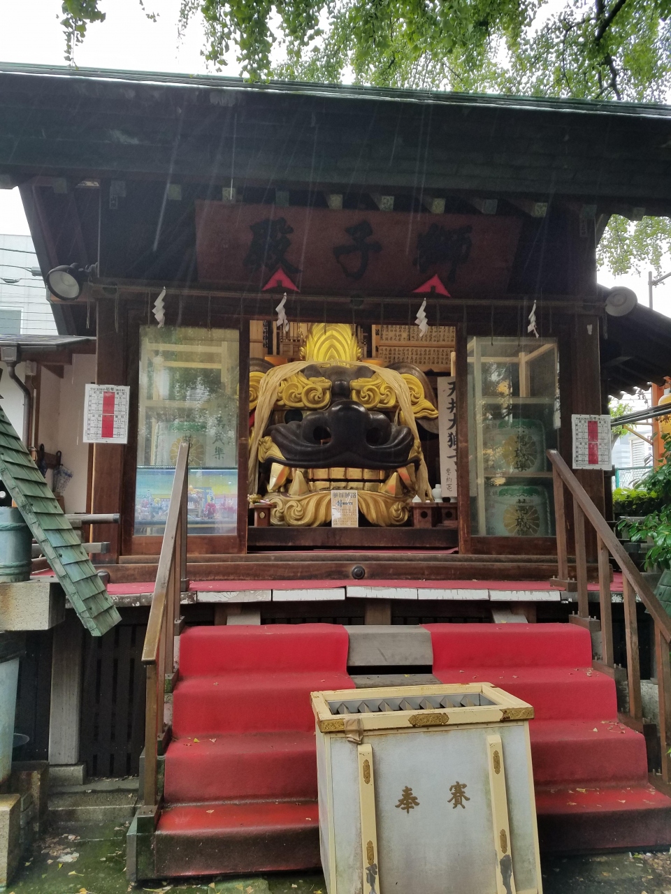 築地場外の奥にある波除稲荷神社の鳥居をくぐると両脇に天井大獅子とお歯黒獅子が迎えます。獅子は、立派な建物の中にある迫力ある姿で、写真に収める観光客が目立ちました。天井大獅子は、願い串を舌の上に納め念じると願いが叶うということです。
