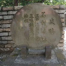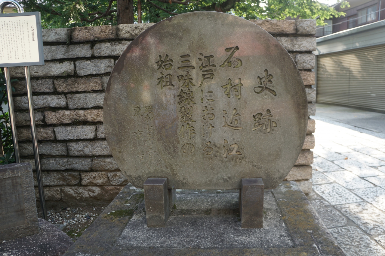 魚籃坂を下ったあたりに構える大信寺の門前。通りに面して、石村近江紹介碑というまあるい石の碑があります。