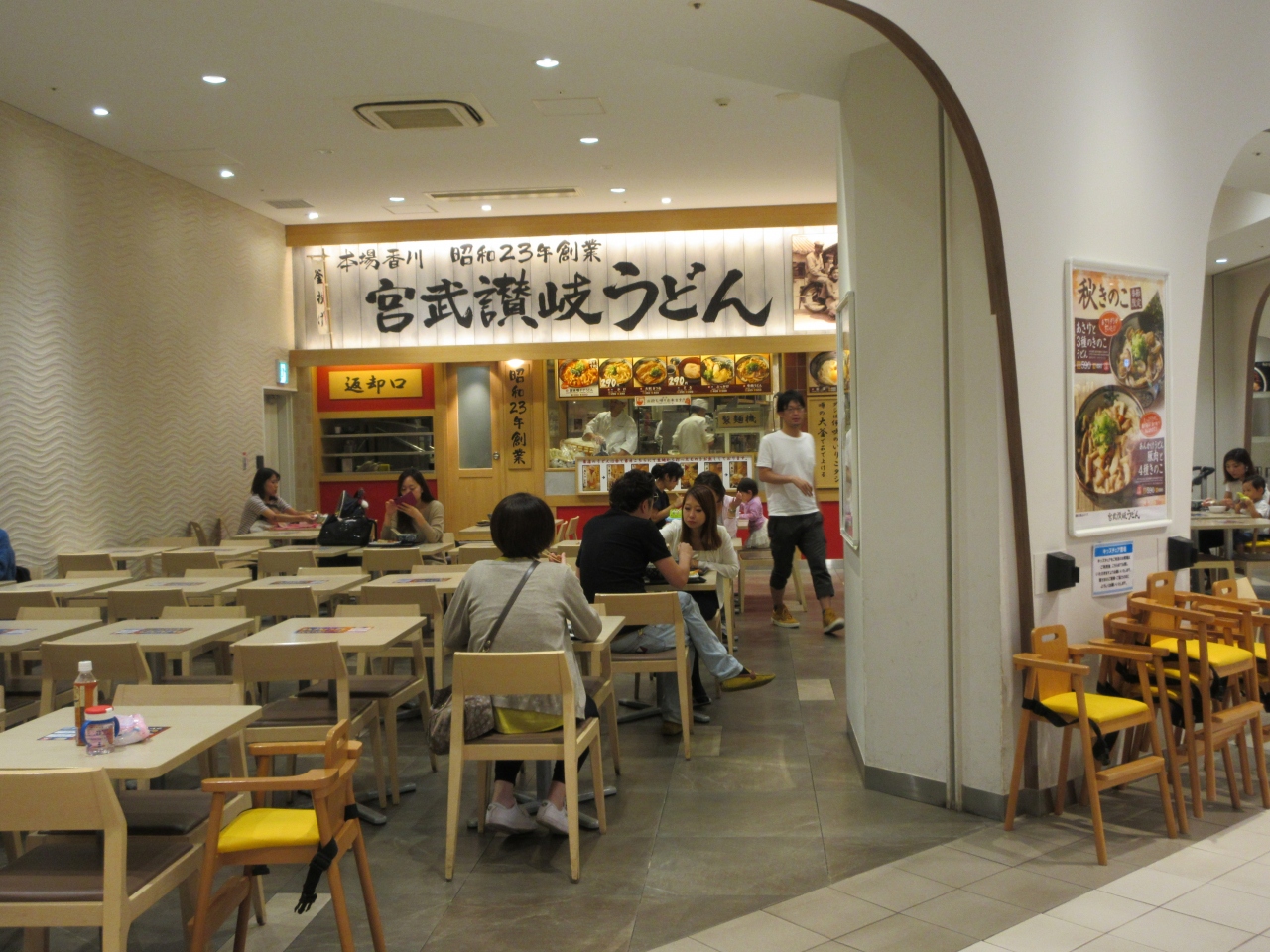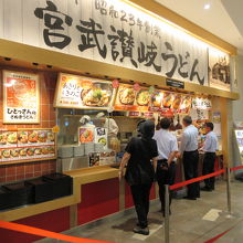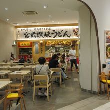 ららぽーと豊洲1階サウスポート内のフードコートにあります。フードコート中心の広いテーブル席で食べることもできますが、宮武讃岐うどんで注文した人の多くはカウンター前の区切られているテーブル席で食べます。休日に昼食を食べた時はぶっかけとすだちうどんを注文しました。好みの讃岐うどんに近い味で、さっぱりとして美味しかったです。おにぎりやてんぷらなどのサイドメニューも揃っています。手軽に早く食べられるので休日昼は混んでいました。区切られたテーブル席にいると店の中で食べているような雰囲気になり混んでいる休日でも落ち着いて食べられました。フードコート内でも人気の店です。