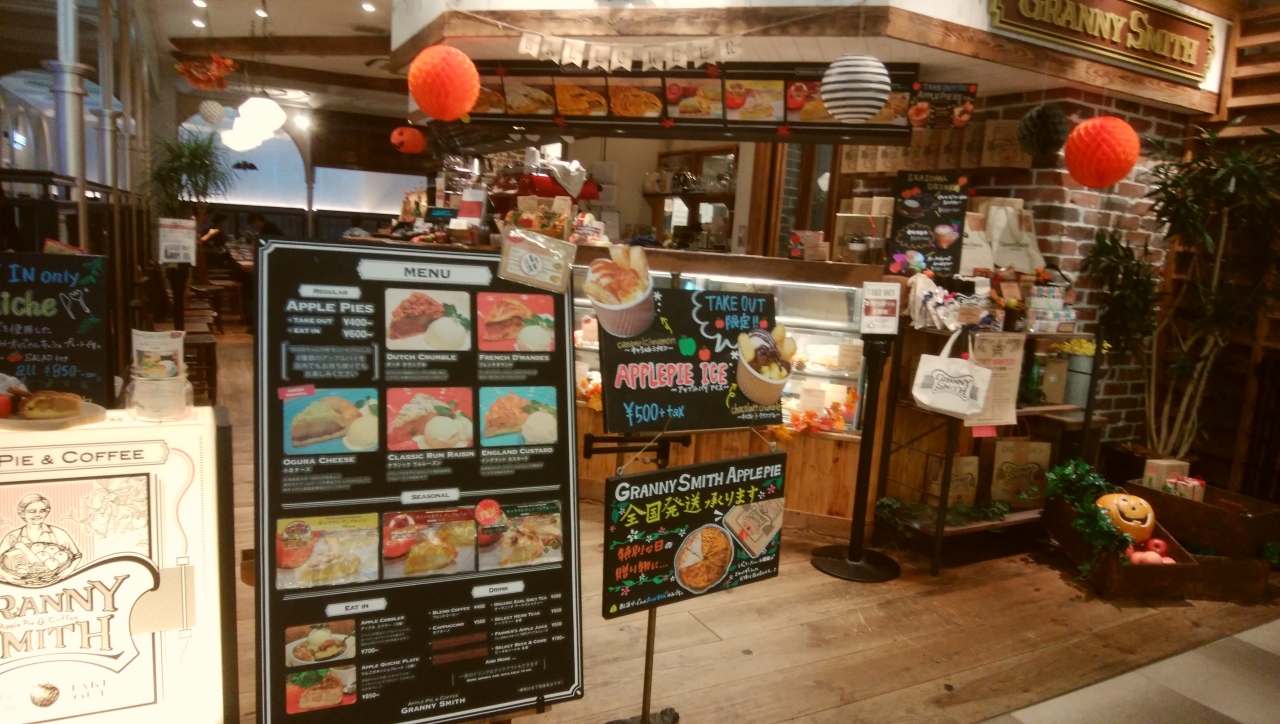 こちらのGRANNY SMITH APPLE PIE & COFFEE は銀座の東急プラザにあって地下鉄の駅から東急プラザ直結なのでアクセス便利です。お店は奥まったところにあります。ハロウィンがもうすぐなので、カボチャとかいろいろかわいく飾り付けしてありました。このお店はウッドテイストであたたかみのある店内と雰囲気なのハロウィンの飾り付けがよく似合います。アップルパイはテイクアウトもできて、こちらの雰囲気にあうような箱と紙袋にいれてくれます。限定で「パンプキン」アップルパイも販売しています。