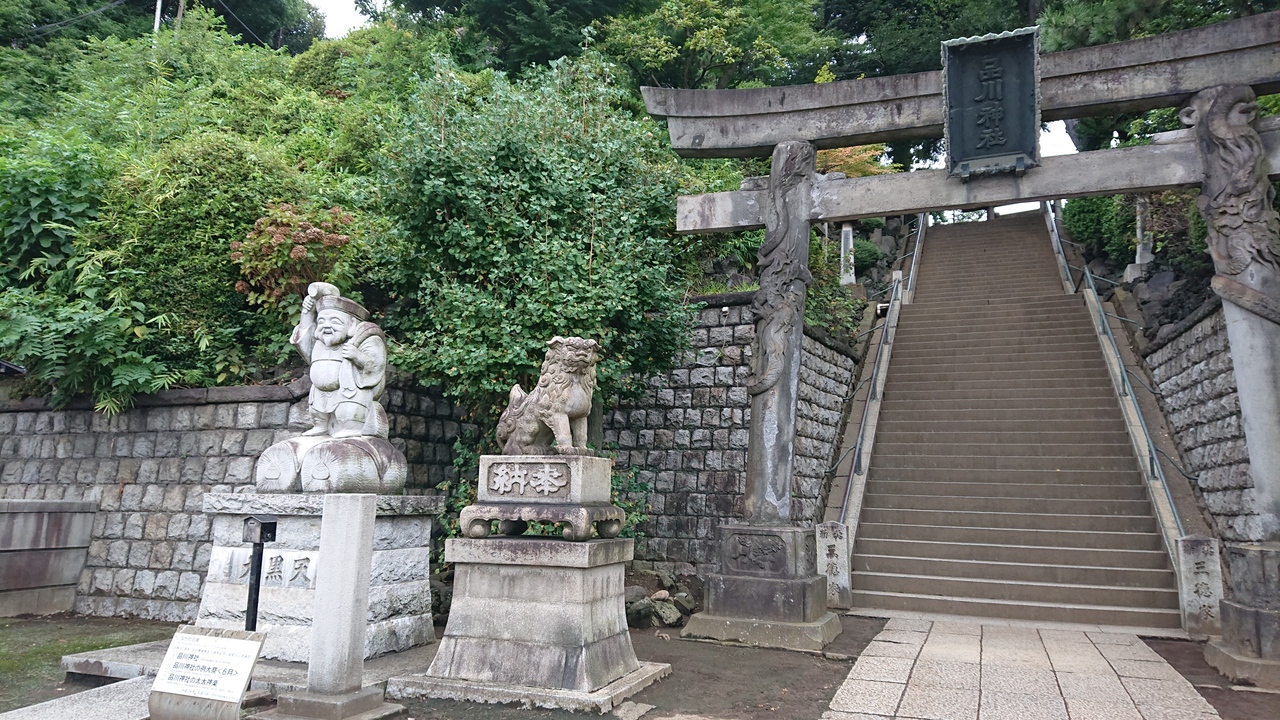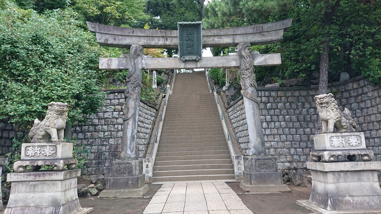 入り口に立派な石像が並び、石造りの鳥居と高い階段から成る、比較的に大きな神社です。