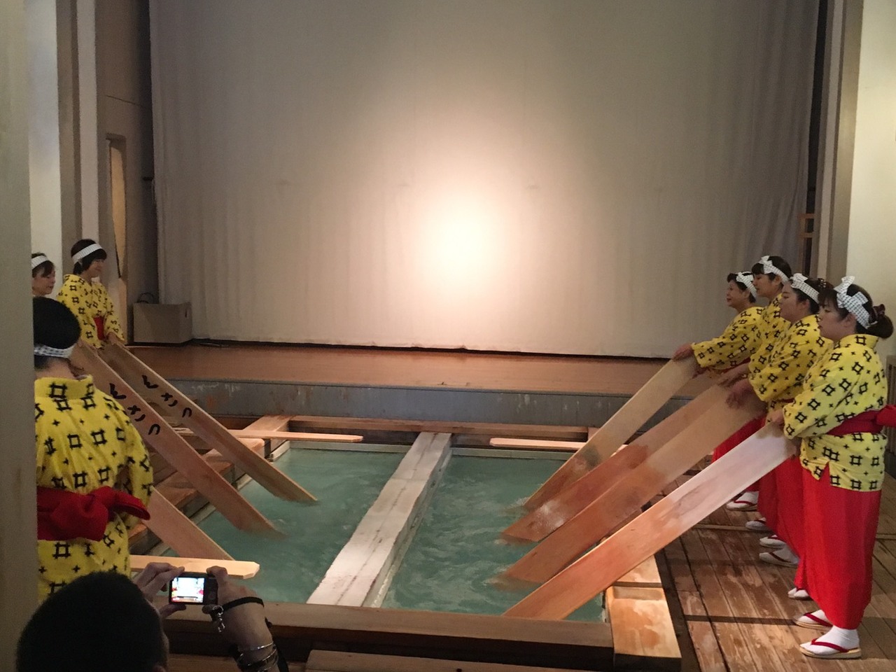 草津温泉にきたらこちらの湯もみショーは欠かせません。湯畑からすぐ近くにある熱の湯で毎日行われています。午後の会に並びました。休日だったためとても混んでいましたが、面白かったです。お客さんが参加できる時間もあるため参加したい方は1階にいるのがオススメです。