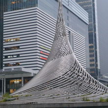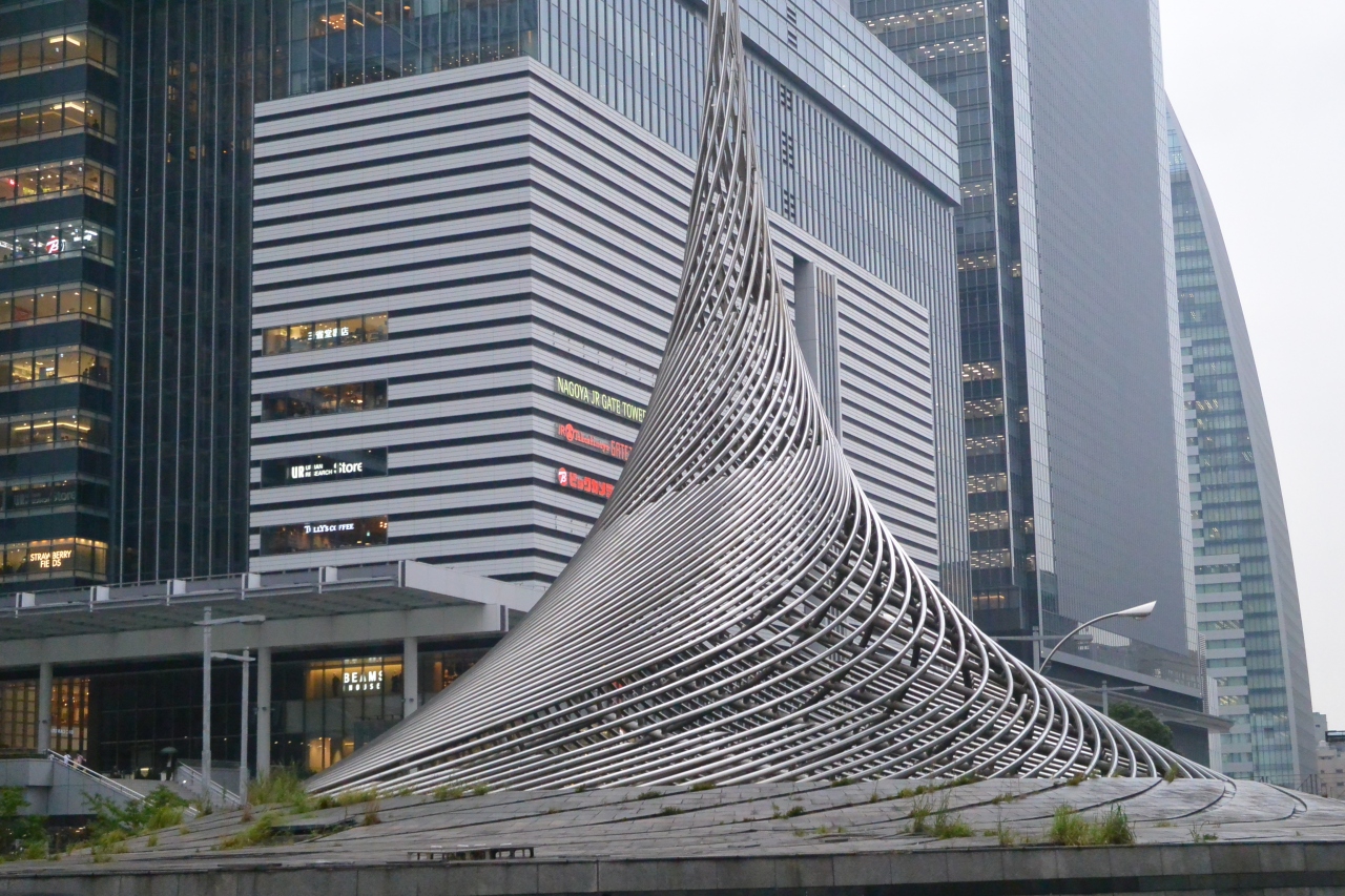 JR名古屋駅の桜通口を出たところにある大きなオブジェですが、車の多いロータリーの真ん中にあって近寄ることはできず、道路越しに見るだけです。なので、目立っているようないないような。これひとつをオブジェとしてではなく、周囲の高層ビルなどと合わせての風景といった印象です。