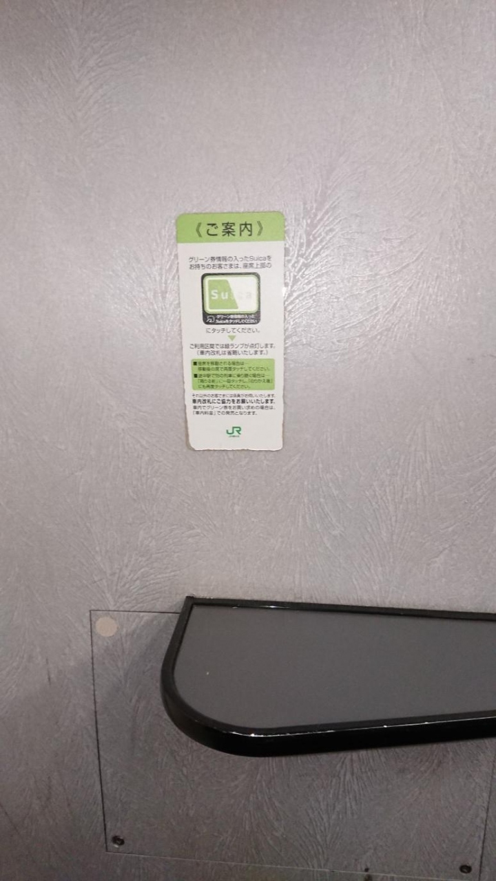 乗車するホームの自動券売機にスイカ(パスモでもOK)を入れてから下車駅をタッチすれば完了。情報がスイカに入力されるのでチケットとかは発券されません。どの電車に乗車してもOK. すぐに来た電車に席がありそうだったのでグリーン車の車両に乗車しました。席を確保したら頭上の赤いランプが点灯してる所に先程使用したスイカをかざす。赤い点灯がグリーンに替わって完了。これをしないと車掌さんが廻ってきて確認するようです。