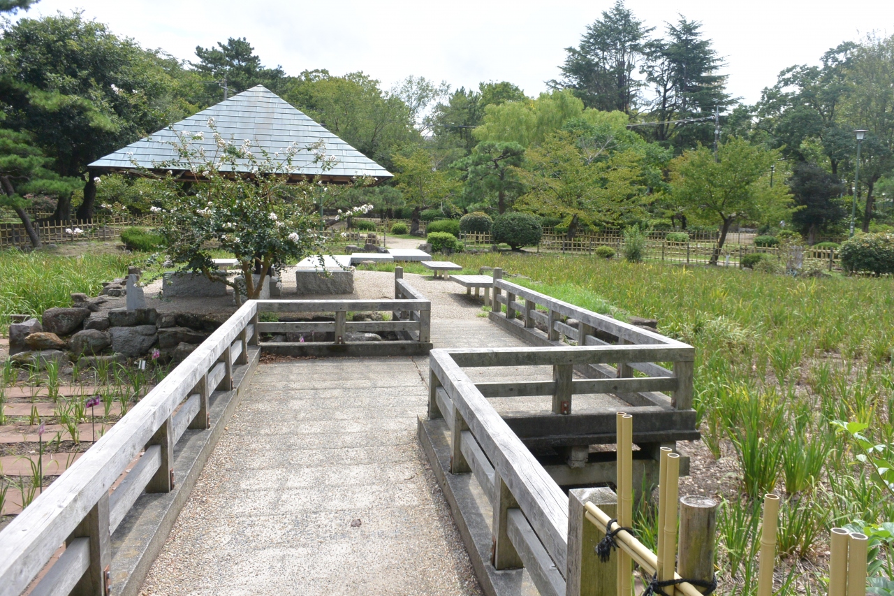 音楽堂、噴水、野球場をはじめたしたスポーツ施設や公会堂、茶室、カフェなどもある広大な公園です。洋式の公園だと思っていたら、日本庭園もあるんですね。池に八橋を模したような橋がかかっていて、季節には菖蒲の花がきれいだろうなと思わせます。訪れた時はバラが少し咲いているぐらいでしたが、他にも桜、アジサイなど季節の花が楽しめる場所になっているのもよいですね。駅を降りてすぐという立地も便利です。