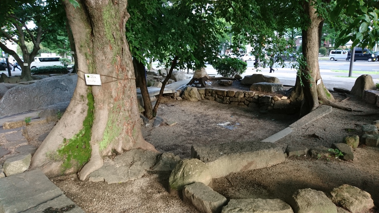 平和記念公園からほど近いところにある旧国泰寺愛宕池。ここの池に使われていた石は磯にある岩礁のもので、江戸時代にはこの辺りが海岸線であったといい。