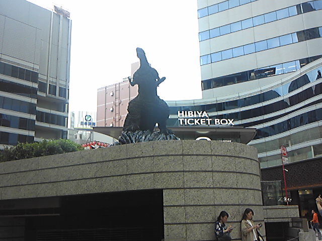 地面で吠えていた「ゴジラ」の像が、なんと屋根の上に!