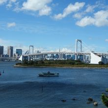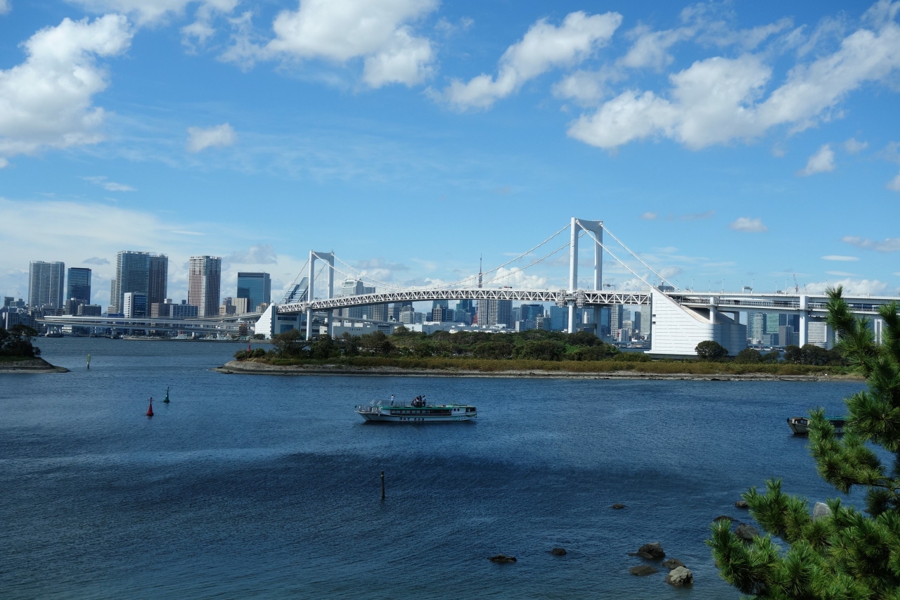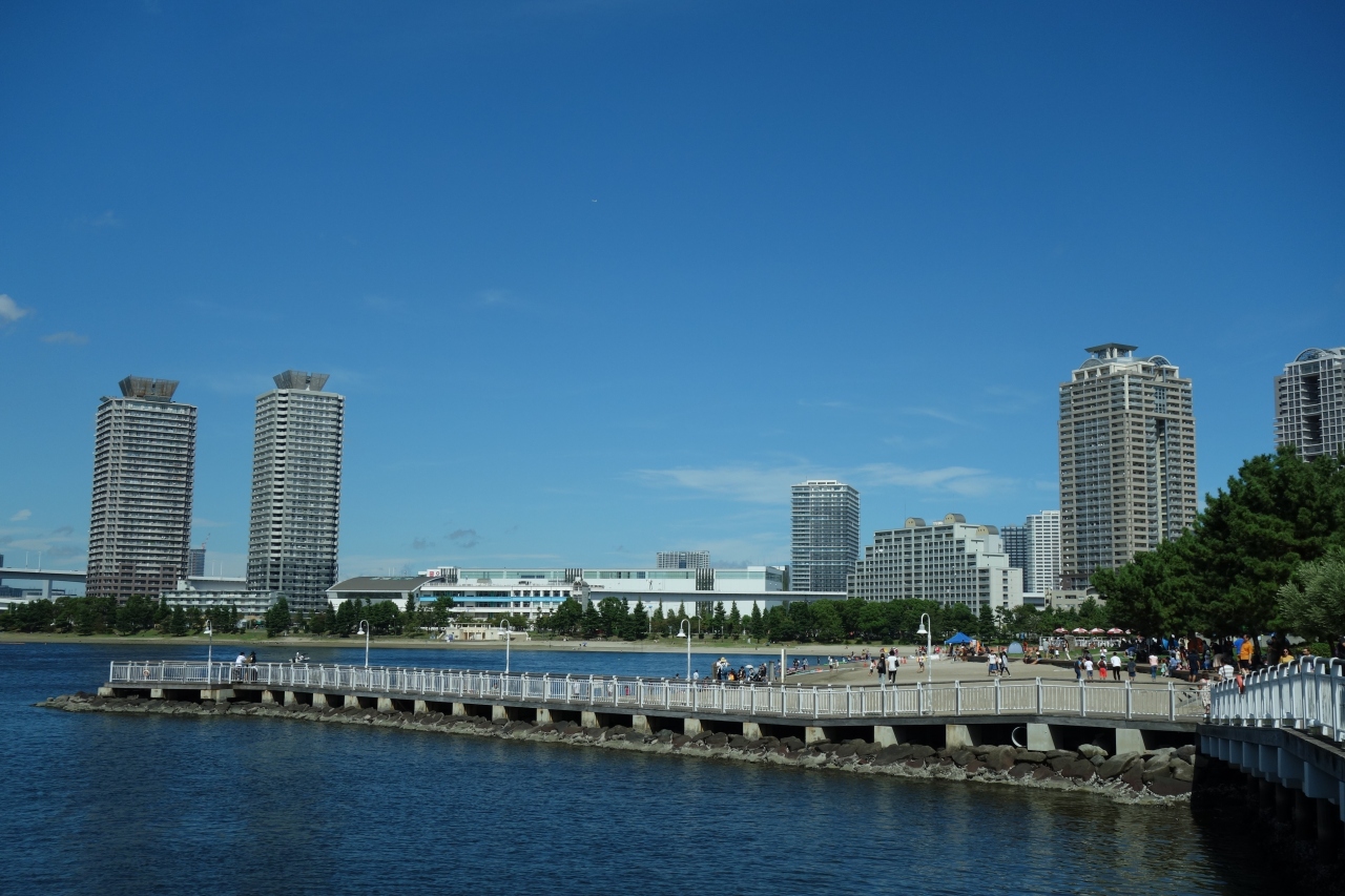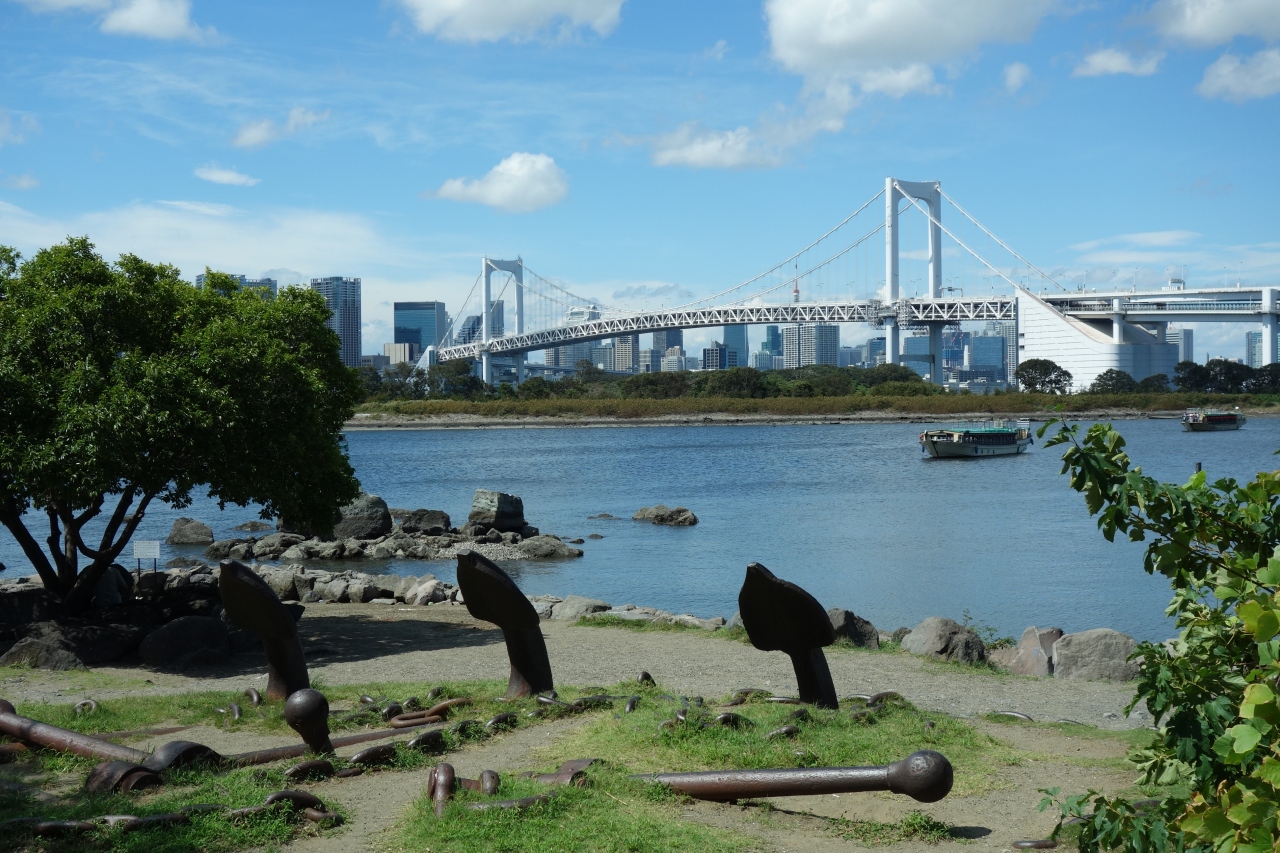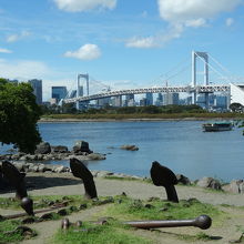 ホントは夕陽が綺麗なんです。だからその頃をお勧めしたいところですが、混雑する所は好きじゃないので、敢えて午前中って言います。砂浜の向こうにレインボーブリッジ、そして東京タワーがビル群に埋もれるように見えて、何と一番手前に見える緑の小島は江戸時代の史跡、台場跡。これって東京の此処でしか見られない景色ですよね。