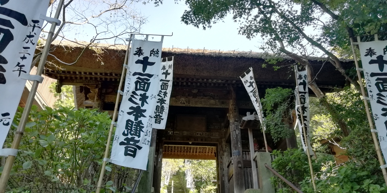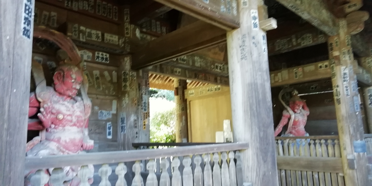 両側に白い奉納旗が何本もたなびく杉本寺の参道の石段を上っていくと趣ある仁王門があります。茅葺屋根の山門で歴史と風格を感じます。運慶作と言われる二体の仁王像が門を守っています。体躯の朱色や衣の色彩は褪せていますが表情と姿はさすがに迫力があります。往時の極彩色を想像してみるとその迫力は如何ばかりかと感じます。
