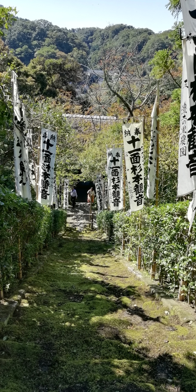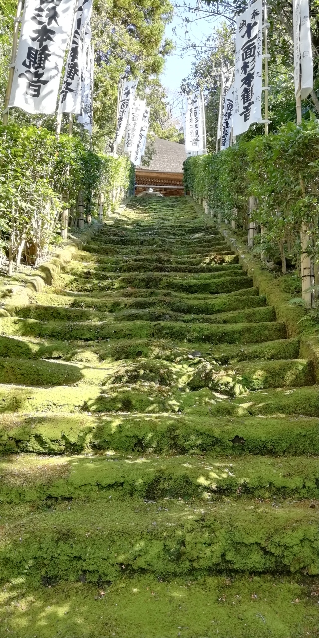 杉本寺の仁王門と本堂(観音堂)を結ぶ参道の石段は苔の階段と呼ばれています。苔に覆われた石段は人が上り下りする部分がすり減っており長い歴史を感じます。木洩れ日の中、緑の苔が美しく、石段の先に本堂の茅葺屋根の一部が青空に映えて見えました。石段前でしゃがんで見上げるように眺めるとより美しく見えます。又、本堂の境内から見下ろす眺めも趣が異なりきれいです。石段は立ち入り禁止で本堂へは左手の別の参道を上って行きます。