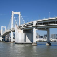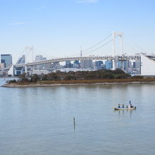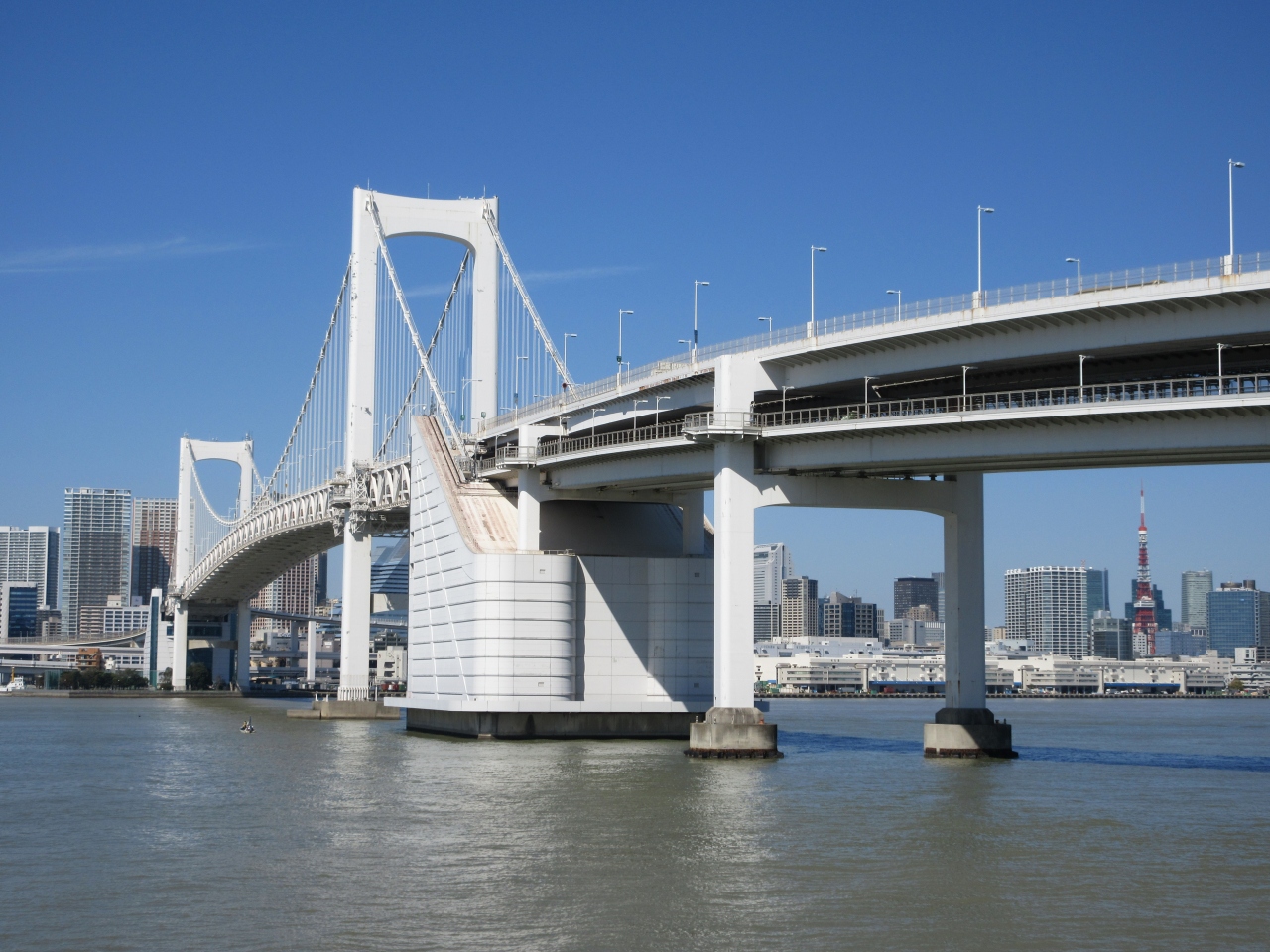 お台場を訪れ、いろいろな角度からレインボーブリッジを眺めてきました。東京港に突き出た台場公園からは橋を斜め下から眺めることができました。お台場海浜公園展望デッキからは橋の全体を見ることができました。アクアシティからは橋を含めた東京港全景を眺められました。普段、車で通ると橋の美しさはあまり感じられませんが、青い空と東京港に挟まれた白いレインボーブリッジの美しさと雄大さを改めて感じることができました。橋をバックに写真を撮る外国からの観光客が多く、東京のシンボル的な橋と言えるかもしれません。