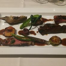 前菜はホタテとサーモンの冷たい前菜、メインは短角牛(+1000円)、デザートはワッフルをいただきました。