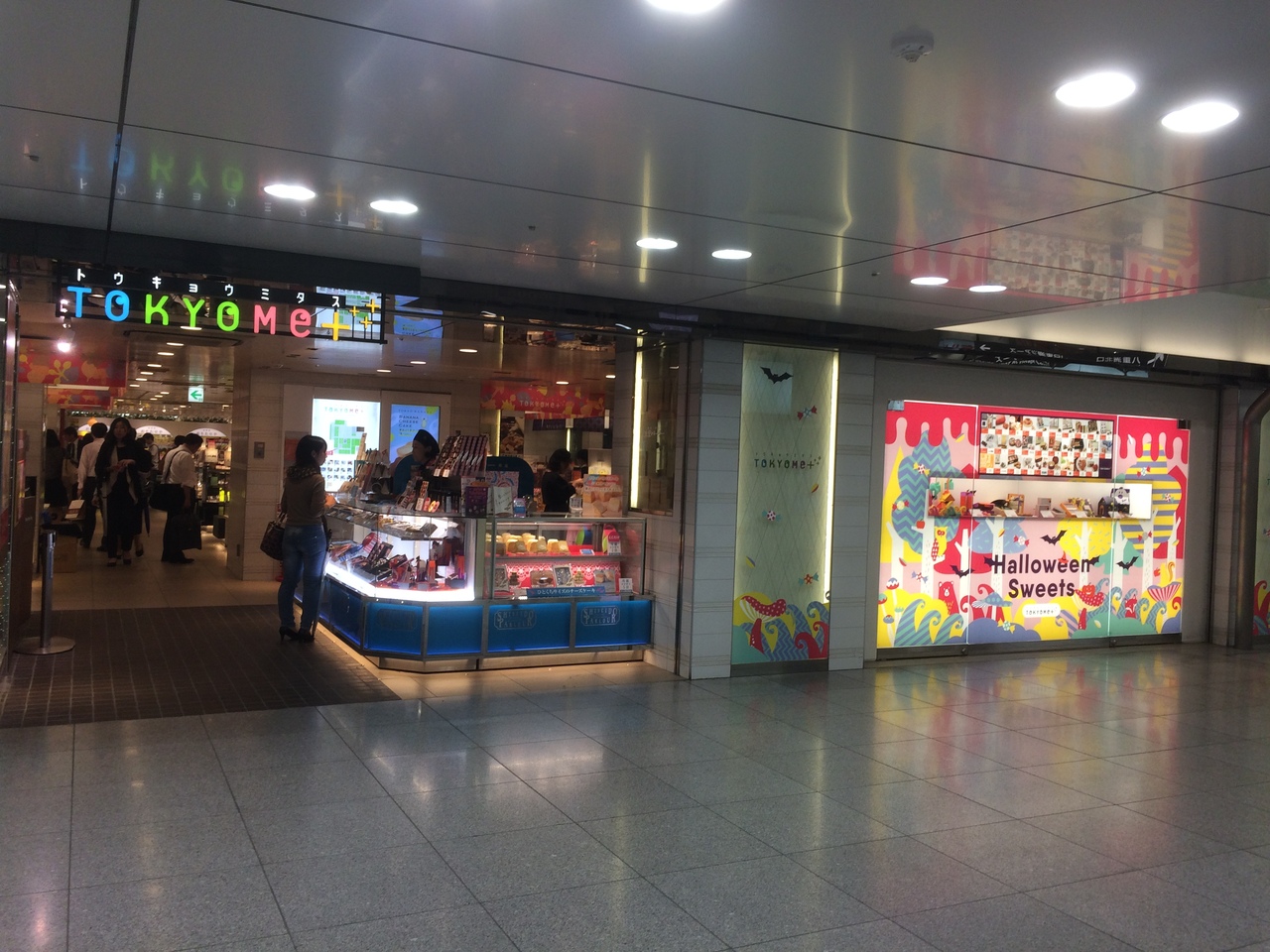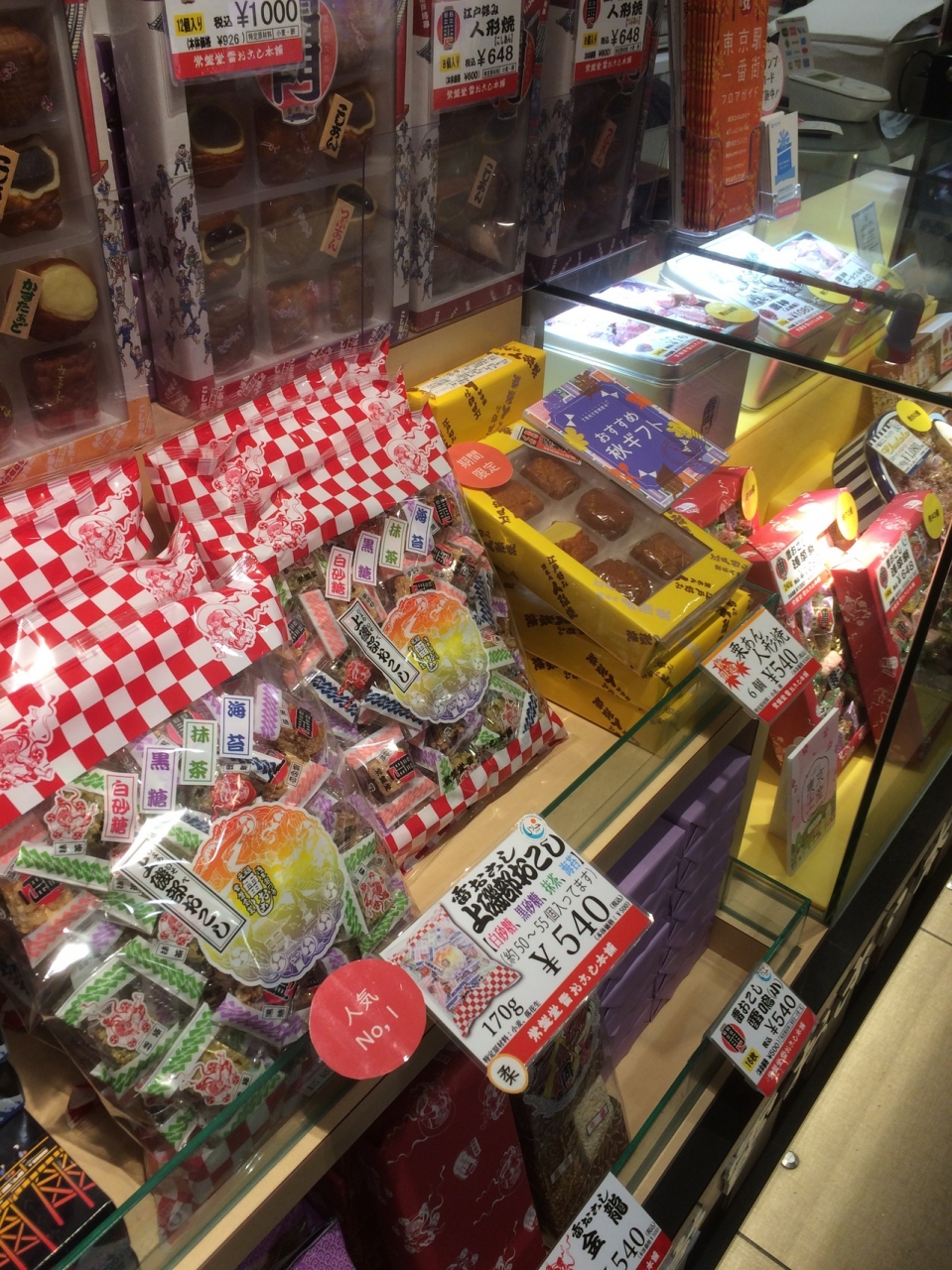 東京駅地下の土産屋が固まっている場所で、たくさんの店があるので一店舗づつ見ていたら、アッと言う間に30分経ってしまいました。どの店も小さな敷地で、店員さんは一人か二人でした。その中でも格安で量が多いお菓子、常盤堂の雷おこしを購入しました。