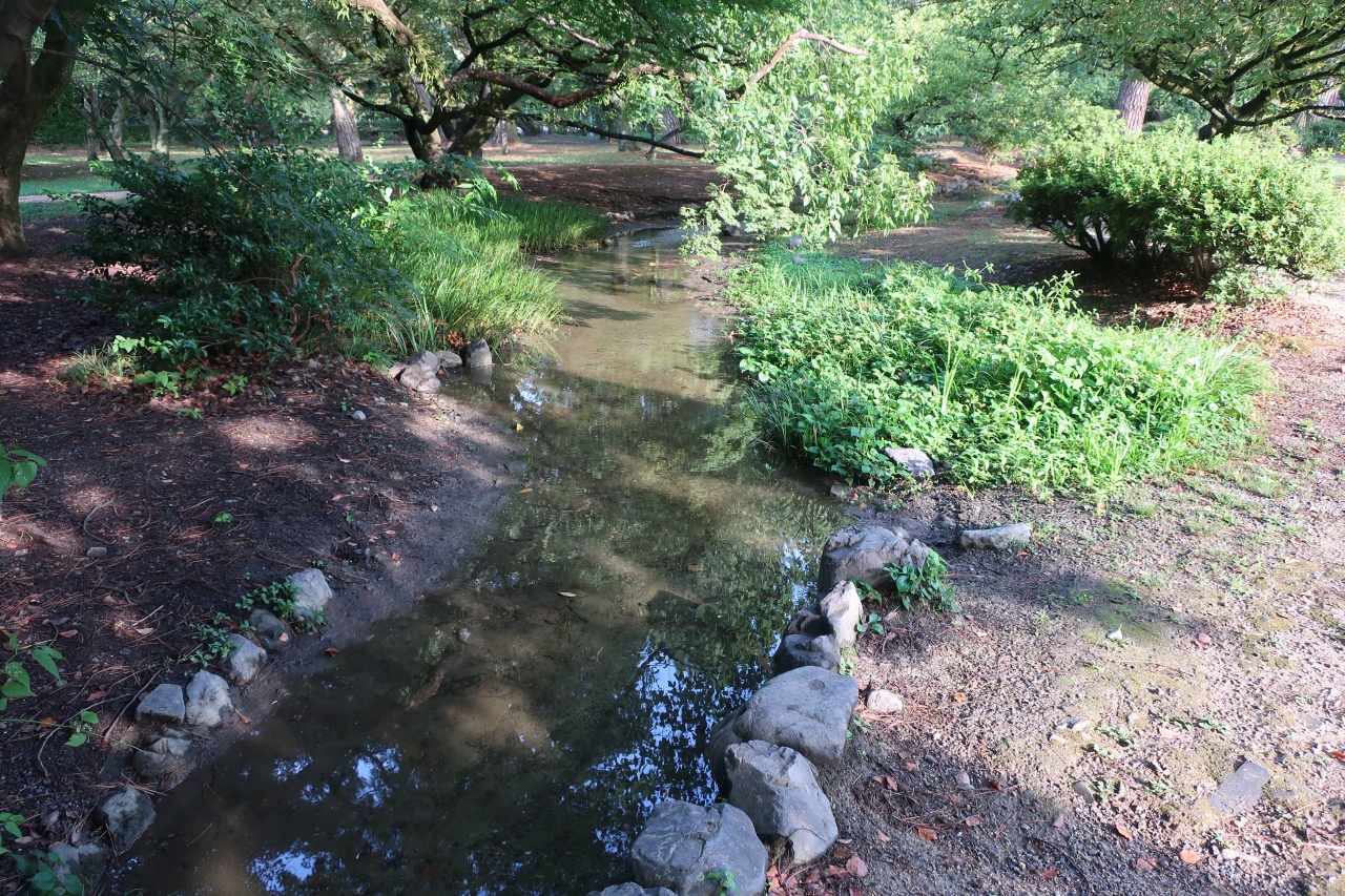 京都御苑を下立売御門から入り50m程行った北側に小さな小川が流れてています。よく見ると湧水の様ではなく人工的に作った小川の様です。