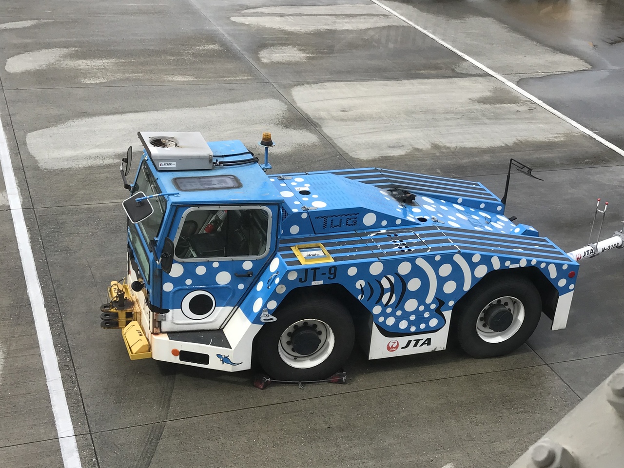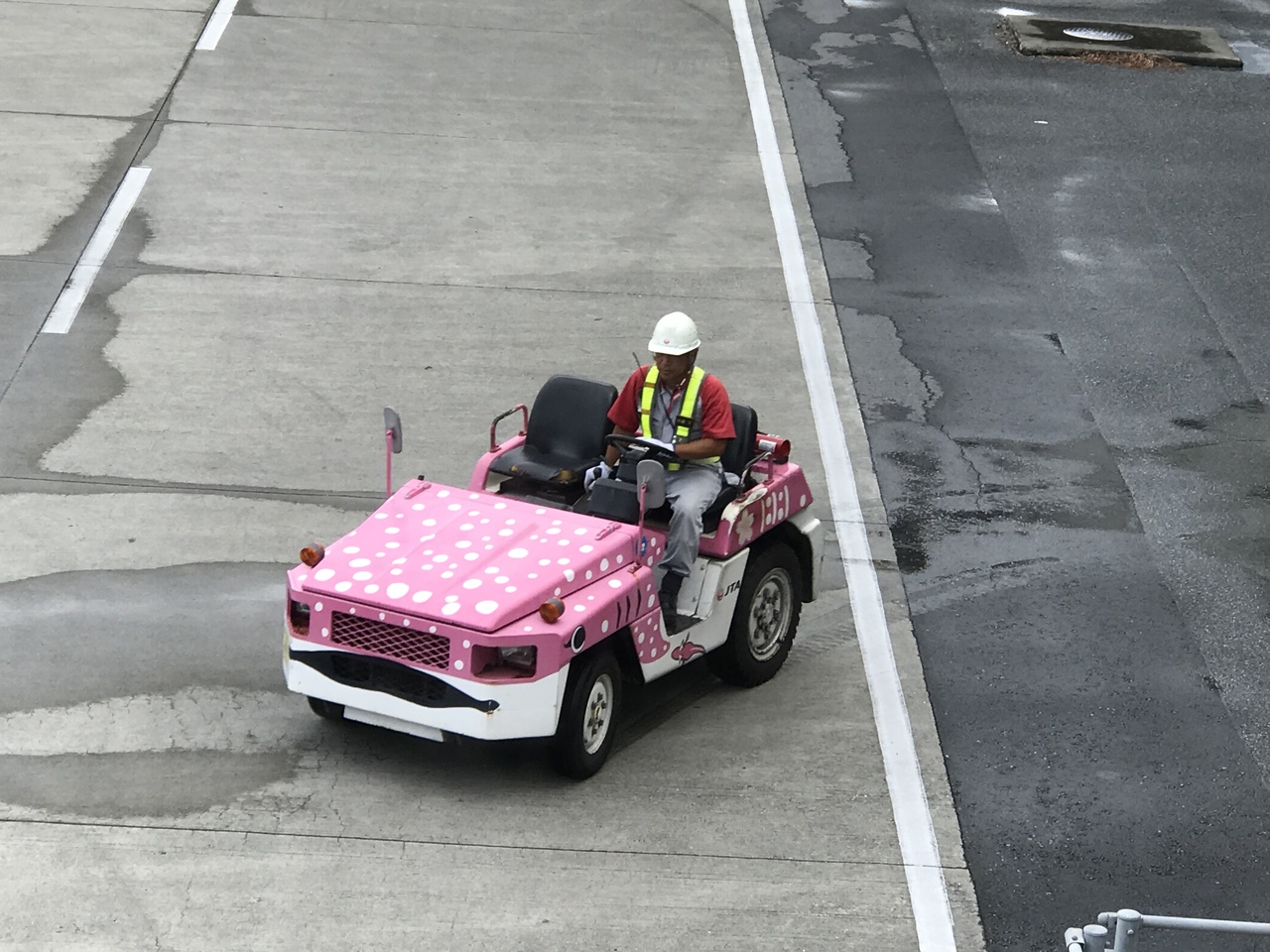 飛行機を降りて、館内へ続く通路から外を眺めると、可愛い車両が走ってました。
