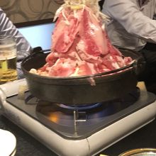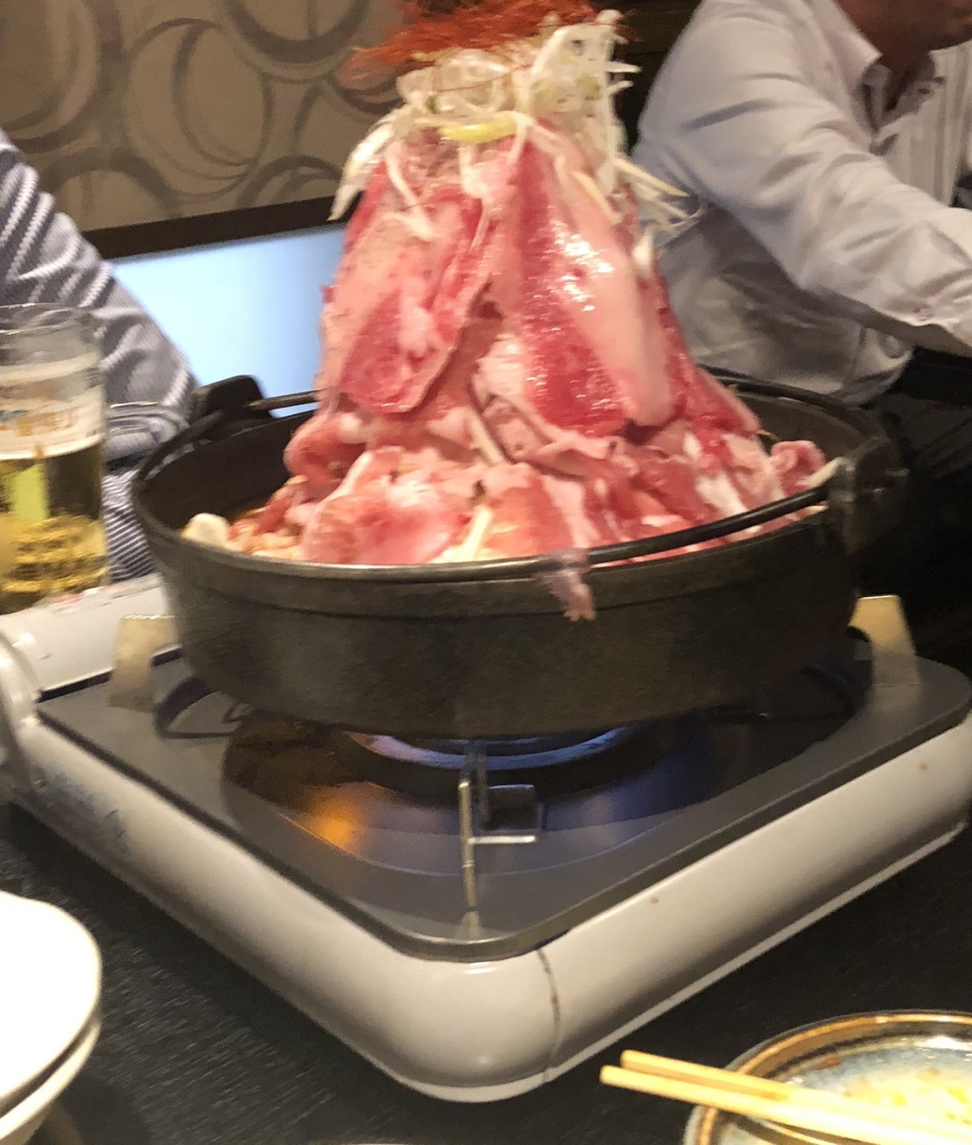 うず高く積み上がった肉は牛、豚、モツなどなど、中心はもやしとキャベツだ。スープは味噌味で肉の臭さは感じない。締めはラーメンで決まり。