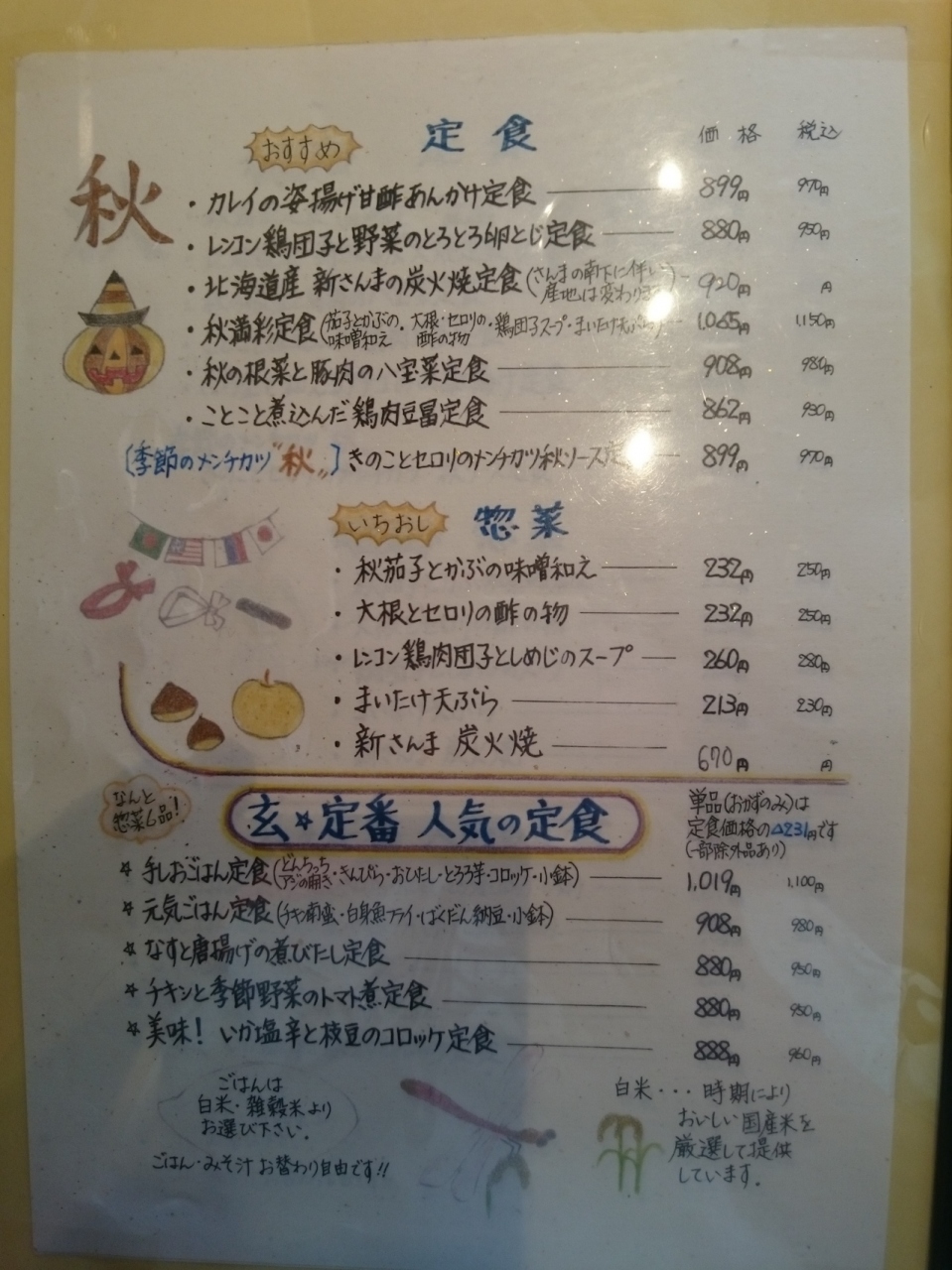 メニューには、季節の定食、魚、肉の定食と3ページにわたって豊富なメニューから選べます。