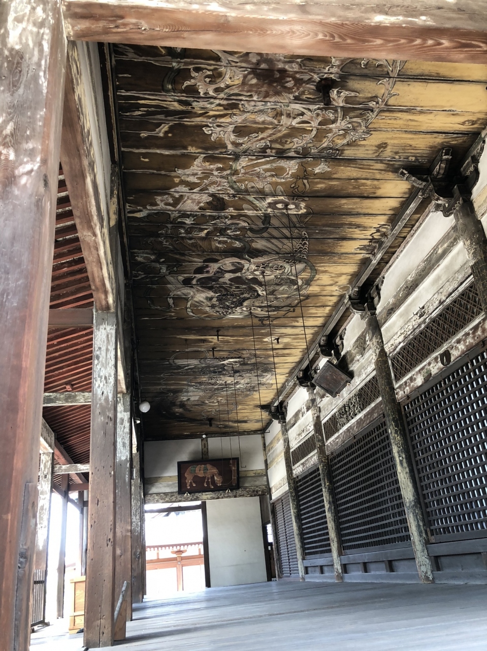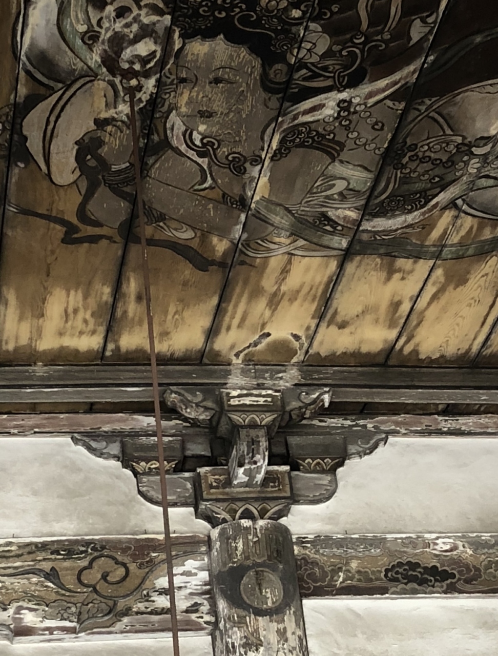 本堂の外側は開放された回廊になっていて、回廊の天井には、天女や龍が描かれている。オープンな状態なので、見るに易いが外気に晒されているので傷みが見えるのは心配だ
