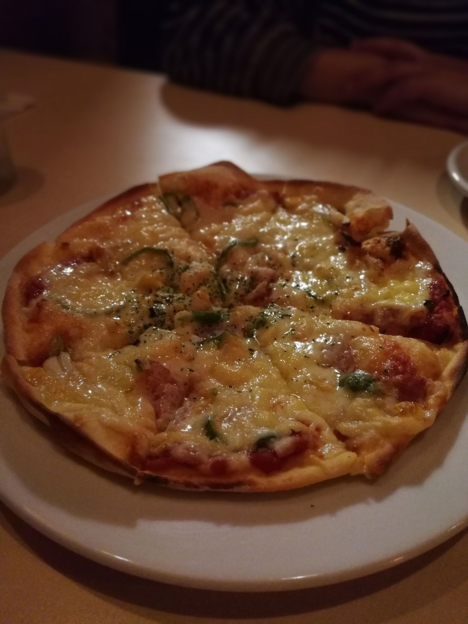 ピザ生地はクリスピー。生地自体は多分出来合いだと思うが、釜の温度が低い割にはそれなりに上手に焼けていた。具はバランス良く載っていたと思う。やたらたっぷり具を載せるピザ店もあるが、このくらい控え目に乗っている方が上品で良いと思う。