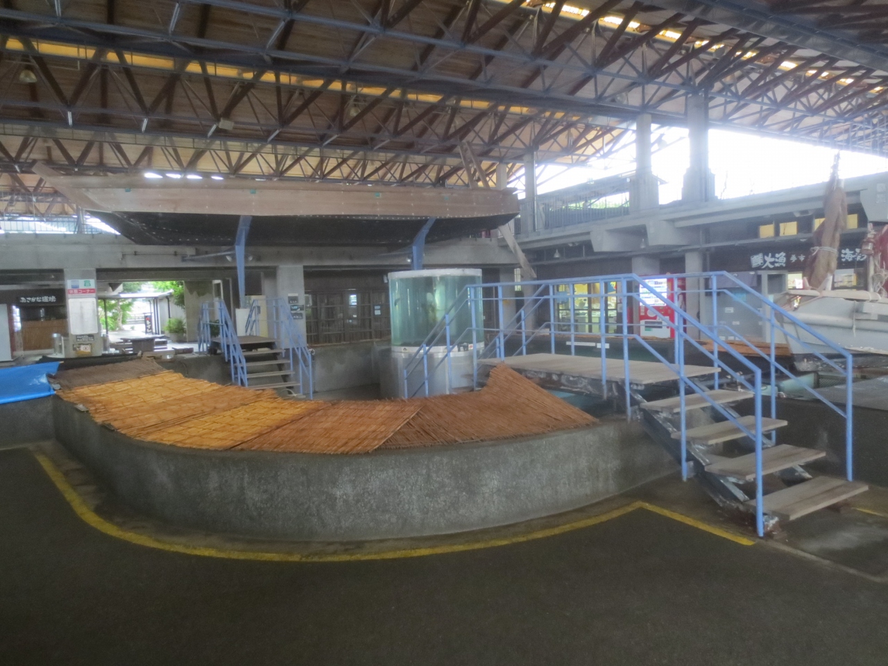お土産屋さんや食べ物屋さんがありましたが、施設内のいけすがユニークで、いけすが筒状になっていて、その中心にも別のいけすがあり、その間の部分に入ることができました。