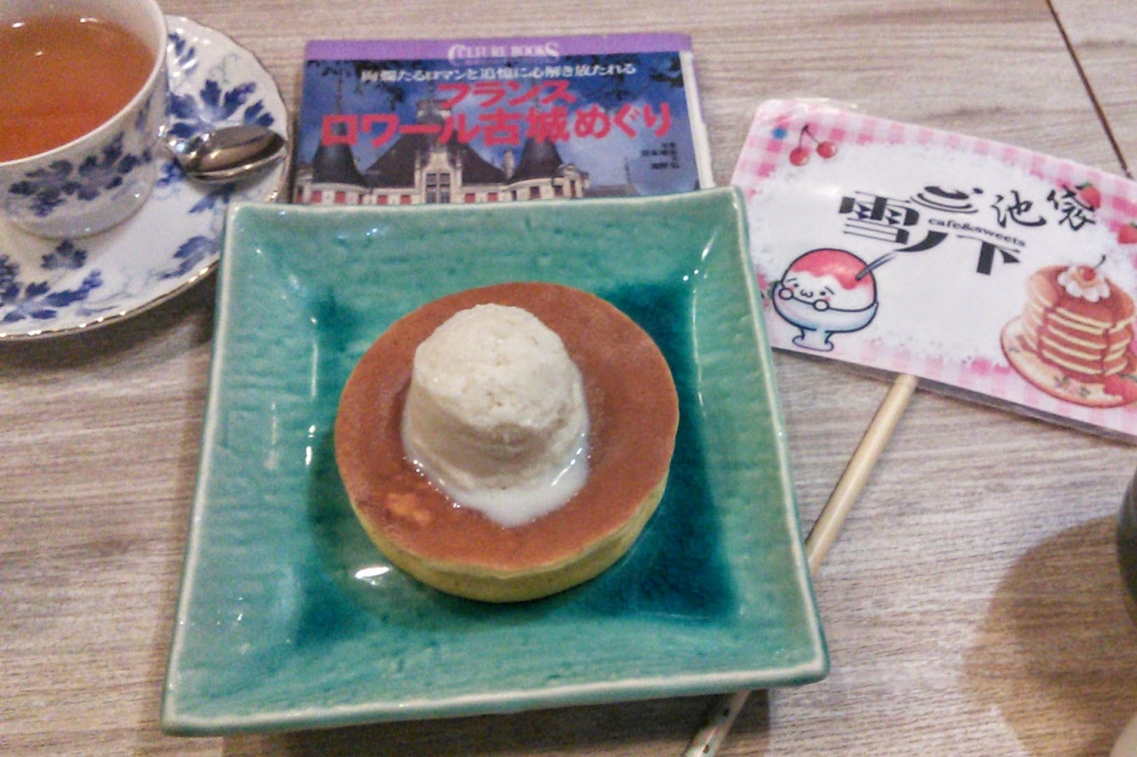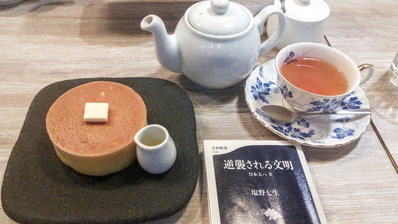 厚さ4cmの発酵バターのパンケーキは、コケコッコー共和国の濃厚な卵の風味が堪能できるシンプルレトロな味わいです。『ちびくろサンボ』や『ぐりとぐら』のホットケーキを連想しました。四つ葉クリームチーズパンケーキは、卵黄のみ使った生地にクリームチーズ、サワークリームが練り込まれているもので、酸味がありおいしくいただきました。1823年創業のドイツの老舗ロンネフェルト社の紅茶も、ポットサービスで飲める貴重な店です。