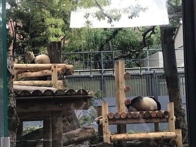 パンダ見学は相変わらず行列が出来ていますが、タイミングや天候によっては30分程度で見れることもよくあるそうです。私たちは雨の予報がでていた金曜日の12:30ごろ到着しました。パンダ見学は「30分待ち」との看板が出ていましたが、実際は20分も並んでいないと思います。時間が短くてラッキー!と思いましたが、要はシャンシャンはじめ全てのパンダがお昼寝中だったため、人の流れが速かっただけなのでは?思いました。シャンシャンは寝ている後姿しか見れませんでしたが、お父さんお母さんと比べてもやはり小さく、コロンとしていてかわいかったです。他の動物もいろいろ見られたし、特にオカピがいるとは知らなかったので、テンションあがりました。