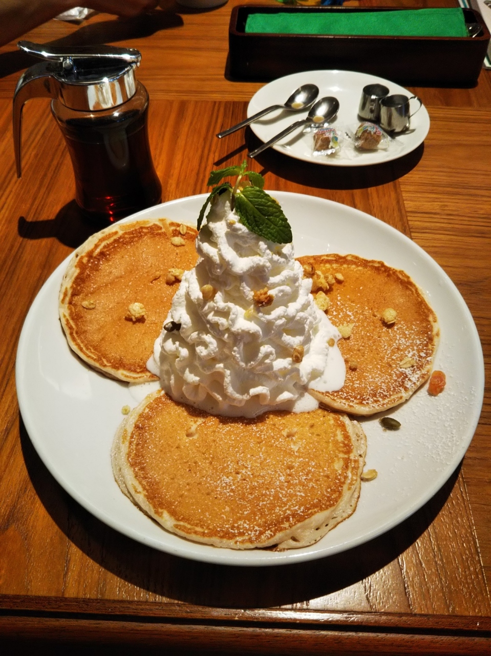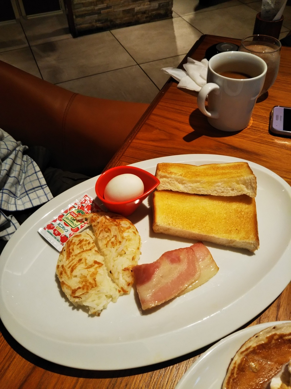 朝食で利用しました。店内に入ると、すぐにスタッフからレイをかけてもらえます。レストランの雰囲気は、まさにハワイ!。気分が上がります。朝食タイムは、ドリンクをオーダーすると、トースト、ゆで卵が無料で付いてきます。また、パンケーキに変更だと、50円プラス。トッピング追加で、ソーセージ、ベーコン、ハッシュドポテトなどがありました。もちろん、ホイップクリームたっぷりのパンケーキの朝食もありますよ。グランドメニューより200円ほど安くいただけます。お得です。グランドメニューでは、ハンバーガー、フリフリチキン、ガーリックシュリンプなど魅力的なフードも。次回はそちらを挑戦してみたいです。