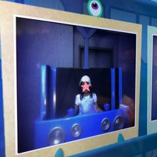 乗物に乗って隠れているモンスターたちを探します。乗物についているライトでモンスターのヘルメットのMマークを照らすとモンスターたちが姿を現します。