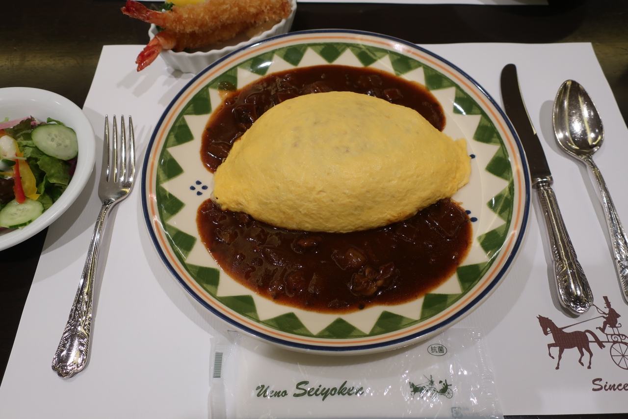 上野恩賜公園の中にある洋食の名店 上野精養軒の出店が上野駅前の3153ビルの3Fにあります。夕方17時半頃に行くと全く待たずに入店することができました(店を出た18時半には入店待ちの人がいました)。注文したのは人気のオムライス。フワフワのオムレツで包んだケチャップライスに味わいあるデミグラスソースが掛かり、納得の味。トッピングで追加したエビフライもサクサクで流石、精養軒。