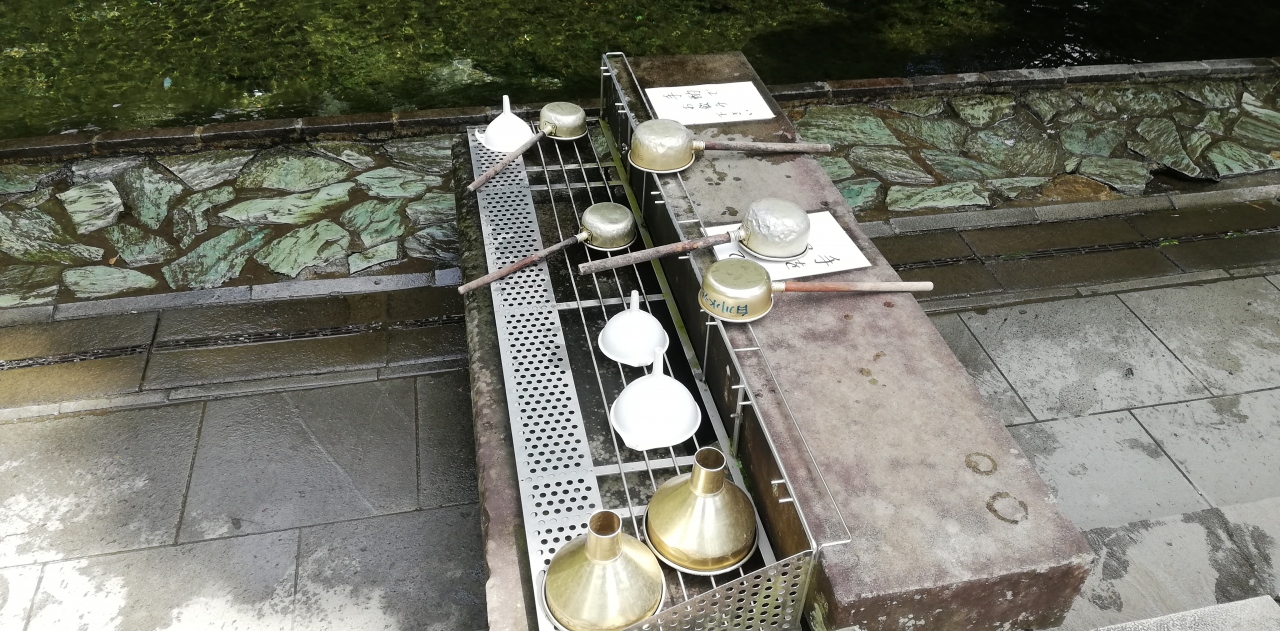 水源近くの売店では、持ち帰り用のペットボトルを売っていますが、ポリタンク(20L)を持って来てお水を汲んでいる人もいます。水源には柄杓と漏斗があるので、簡単に水を汲むことができます。