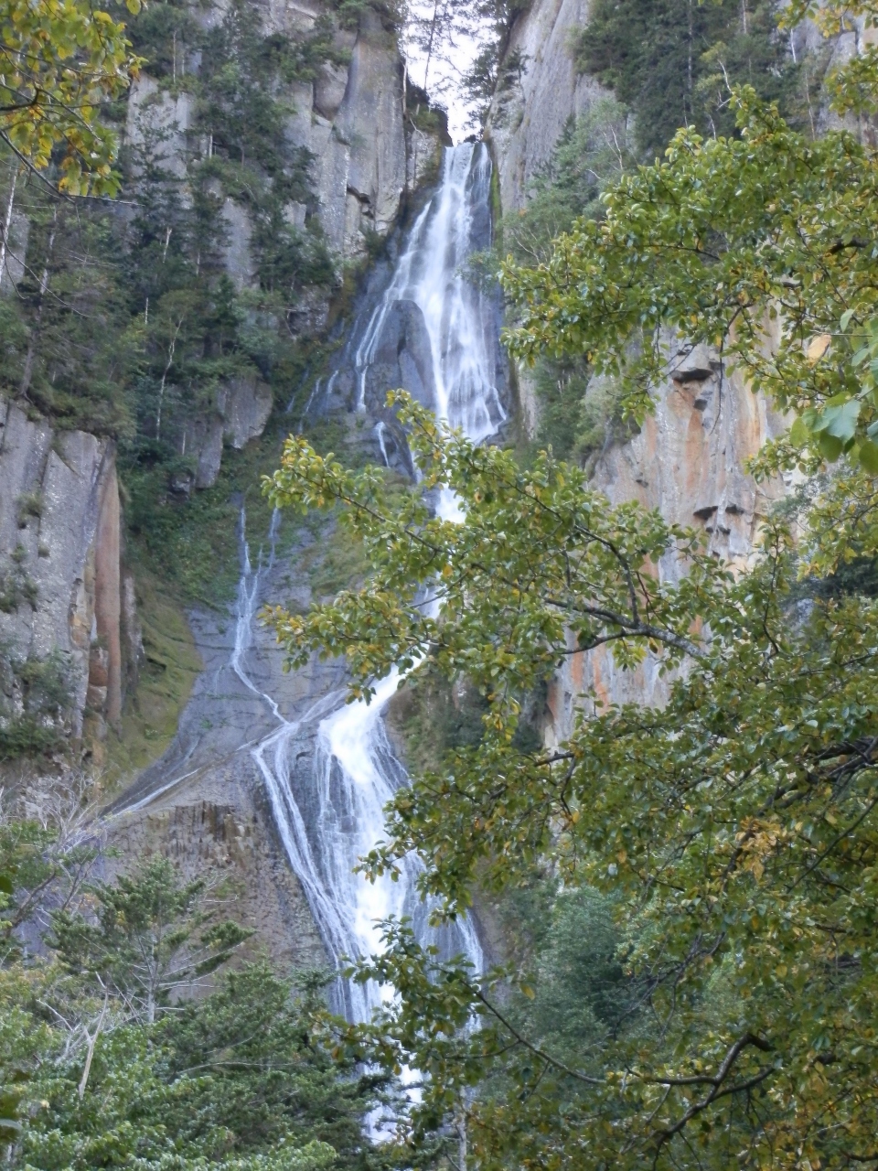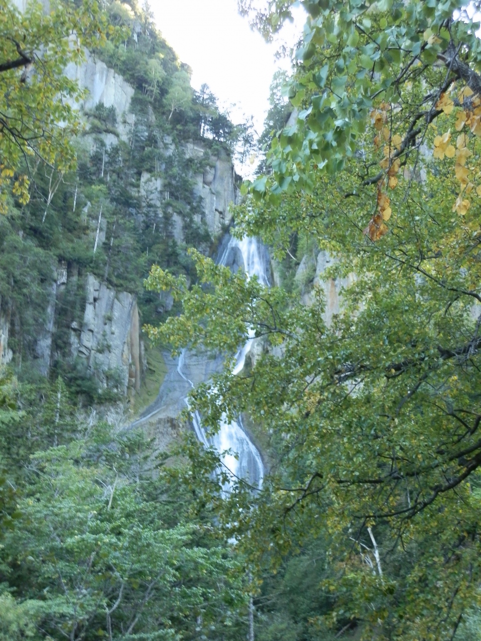 岩伝いに流れる銀河の滝、水量は思ったよりあり、ダイナミックだ。銀河の滝は直線的に落下するのでなく、岩肌の斜面を這うように流れ落ちていた。その姿は白糸を垂らしたような流身を持つ優雅さと例え、雌滝と呼ばれている。遊歩道を歩きながら見ることによって、様々な顔の「銀河の滝」を見ることができました。一か所から見るのではなく、多方面から見ることをお勧めします。必ず、新しい発見があります。
