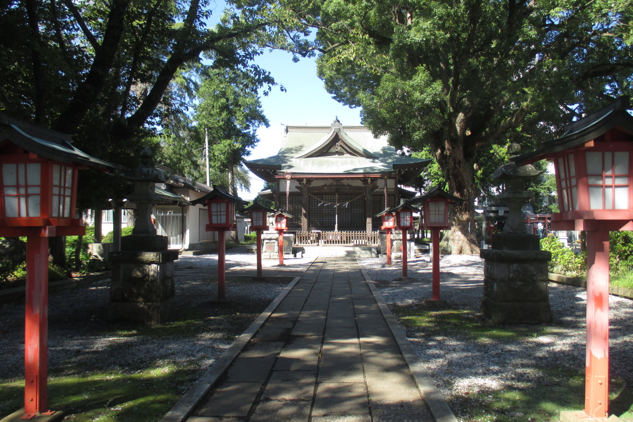 正面の鳥居の方向から見ると、本殿前の右手に大きな楠があることもあって、鎮守の森のような趣があります。もっとも、参道の右側は近所の子供達の遊び場としてぴったりの大きな広場になっていて、明るく開けた様子ですが・・・。お祭りの時には露天が並ぶのでしょうか。