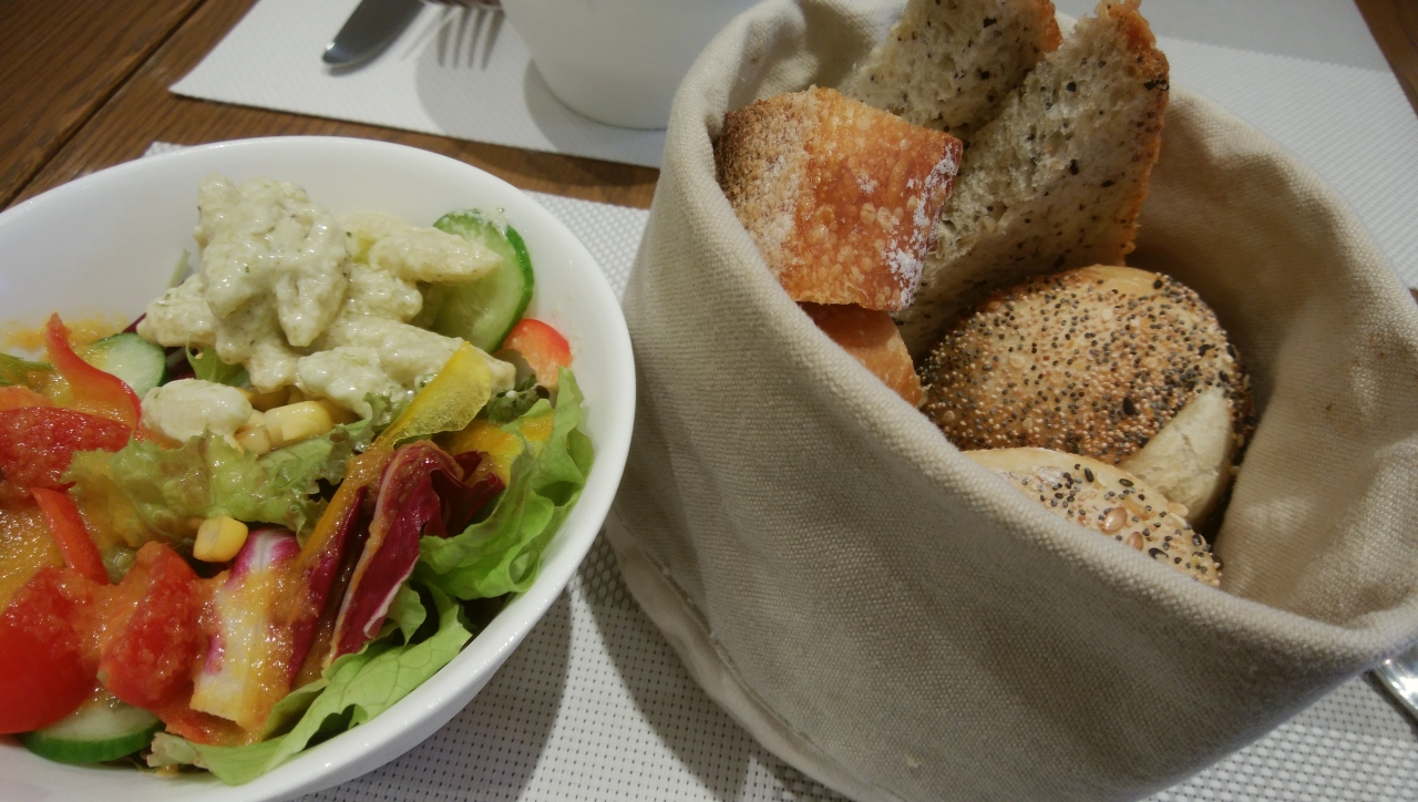 ランチで伺いました。もっと種類があるとおもったら、サラダとスープのランチか、本日のメインとサラダとミニスープのランチと、ブランチセット(2名用)というのがランチメニューでした。ここのランチはパンが食べ放題。でも14:30ラストオーダーで14:25にいったので、お代わりしようとおもったときにはほぼパンがなくてちょっとがっかり。トースターがあり、バルミューダの高級トースターでパンを温めることができます。