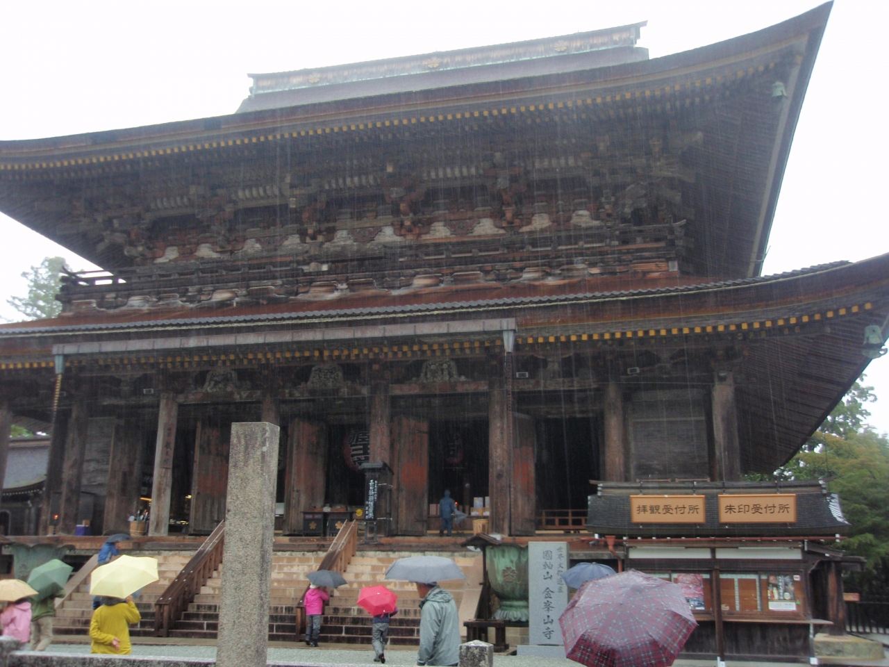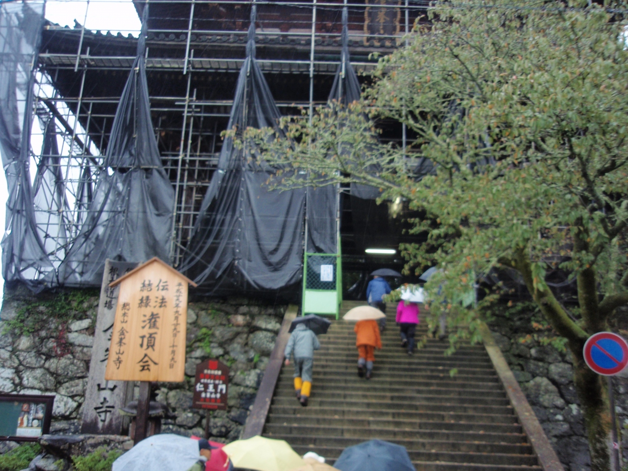 雨のため、大台ケ原歩きを途中で断念し、レンタカーで大台ケ原駐車場から2時間のところにある金峯山寺に寄りました。金峯山寺は奈良県吉野郡にある金峯山修験道の本山で、開基は役行者といわれています。石段を登ると修理中の国宝仁王門があり、その両脇には二体の大きな仁王像が迎えてくれます。門をくぐるとこれも国宝の本堂(蔵王堂)があり、余りの大きさ(日本第二位の木造建築)に圧倒されます。また本堂の前には大塔宮(護良親王)御陣地という石碑が立っており、日本史の勉強で教わった、なつかしい名を見ることが出来ました。秘仏ご本尊三体(釈迦如来、千手観音、弥勒菩薩)は本体が青色した仏様です。春の公開時には是非拝観したいものです。普段は混んでいるそうですが、本日は雨のためか参拝者は少なく、ゆっくり参拝できました