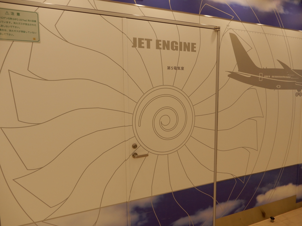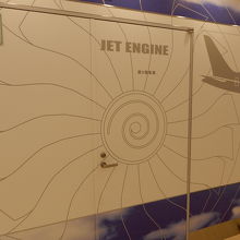 実物大のランディングギアとジェットエンジンのブレードの大きさを見て取れます。