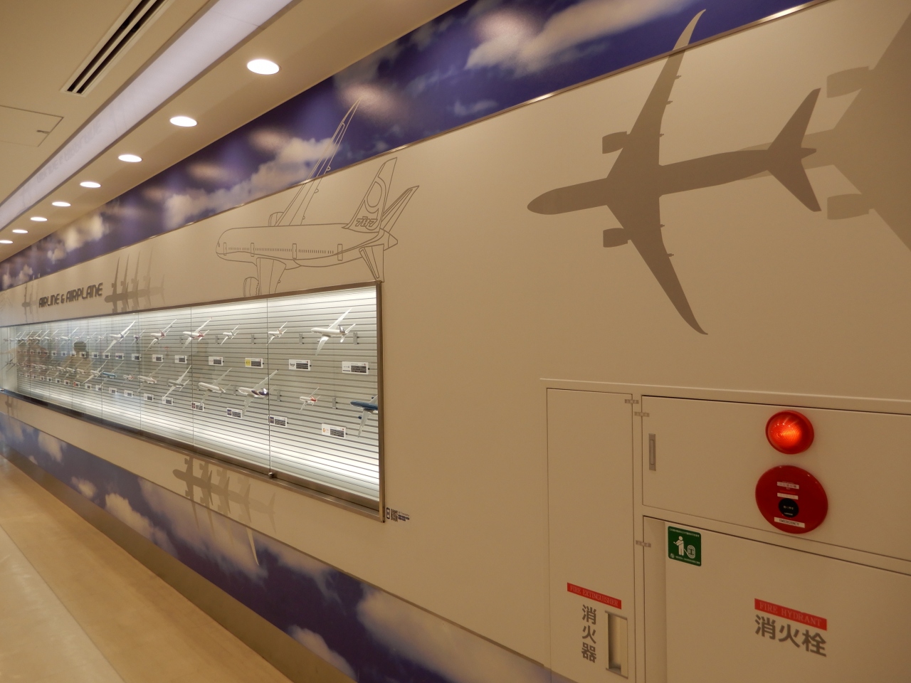 通路の両側の壁に飛行機の模型と図面のような絵が展示してあります。
