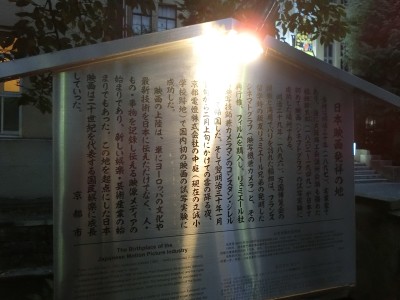 高瀬川沿いにある旧 立誠小学校前に説明板が立っていました。1897年にこの場所で国内初の映画の試写に成功したとのことです。説明板のみで石碑はなく、少々物足りなさを感じました。「発祥の地」を謳うのであれば、石碑ぐらい立てた方が良いのではないだろうかと思いました。