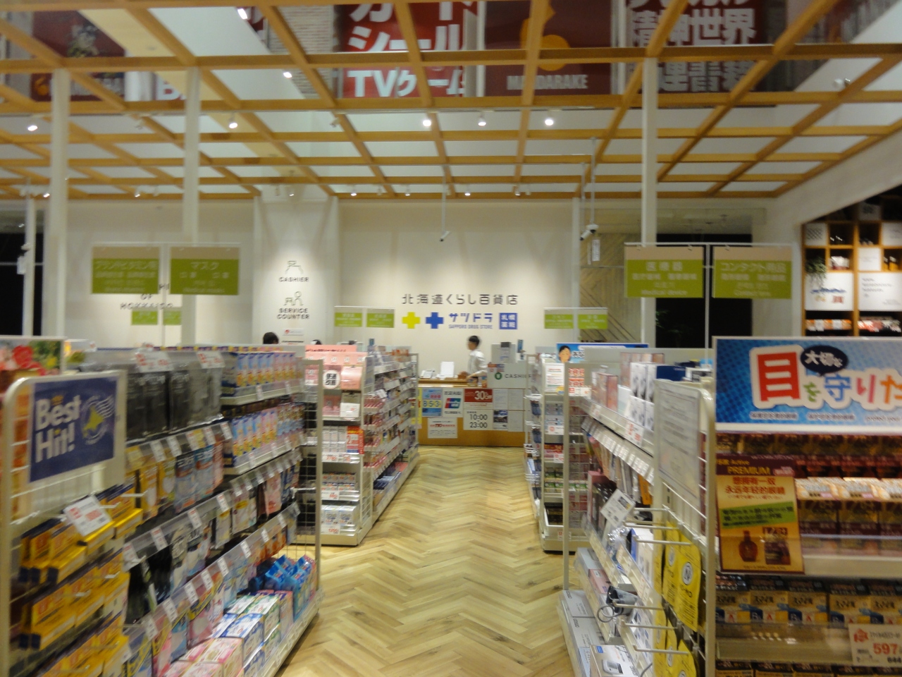 観覧車を目指せして行きます。一階のくらし百貨店は道内各地の特産品、雑貨などあり、定番お菓子と違うお土産選びが出来ます。一年ぶりに行ったら規模が半分になり、観光客向けなのかサッポロドラッグストアになっていました。