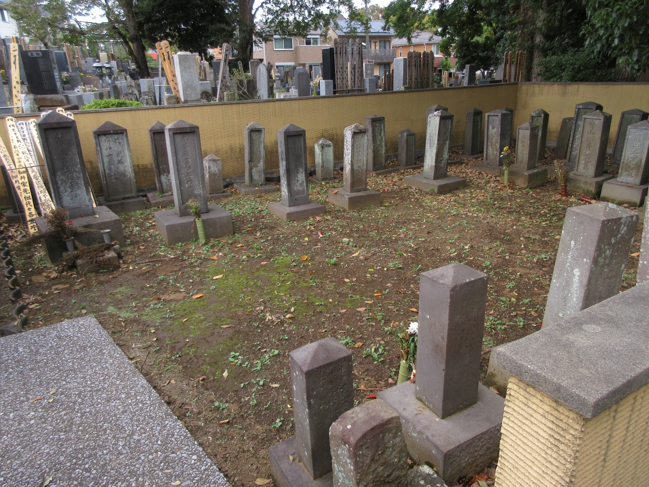 東急大井町線・等々力駅から5分ほど、等々力渓谷散策の際に立ち寄った満願寺に眠っています。江戸時代の著名な書道家で、寺の山門に掲げられた額の文字を書いた方だそうです。墓は寺の本堂の裏にあり、広い墓域に一族と思われる人たちの墓石と共に並んで建っています。吉良邸討ち入りの計画にも協力したにもかかわらず、柳沢吉保から寵愛を受けていた人物です。初めて名と功績を知りましたが、歴史に名を遺す人物だったことがわかり、有意義な散策になりました。