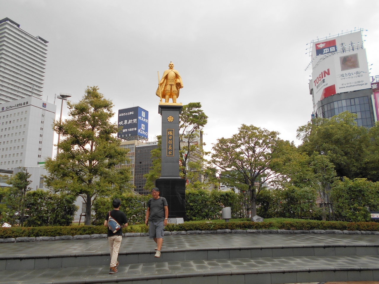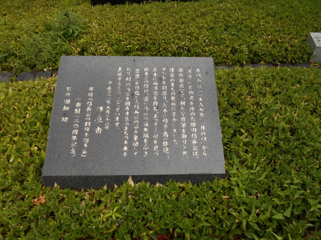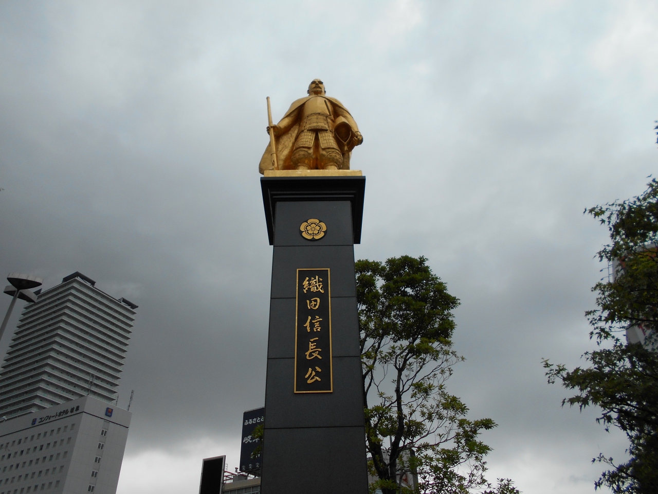 JR岐阜駅中央北口前の広場に輝いて建つ黄金の織田信長公の立像。岐阜市制120周年記念で2009年に建立されたそうです。岐阜に着いた人を見下ろす様な態度で出迎えてくれます。高さ11mの金箔づくりで岐阜駅ホームからも良く見える程目立っています。岐阜と言えば織田信長なのでしょうがないのでしょうがちょっとやり過ぎの感があります。